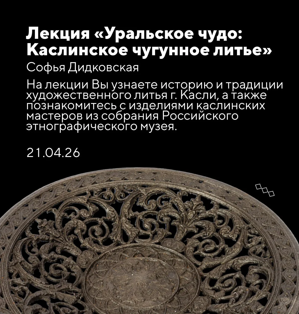 🔻10.03.2026 – «Золотошвейное искусство Средней Азии. Особенности изготовления и бытования». Лектор – Старостина Ольга, руководитель научного направления Российского этнографического музея.