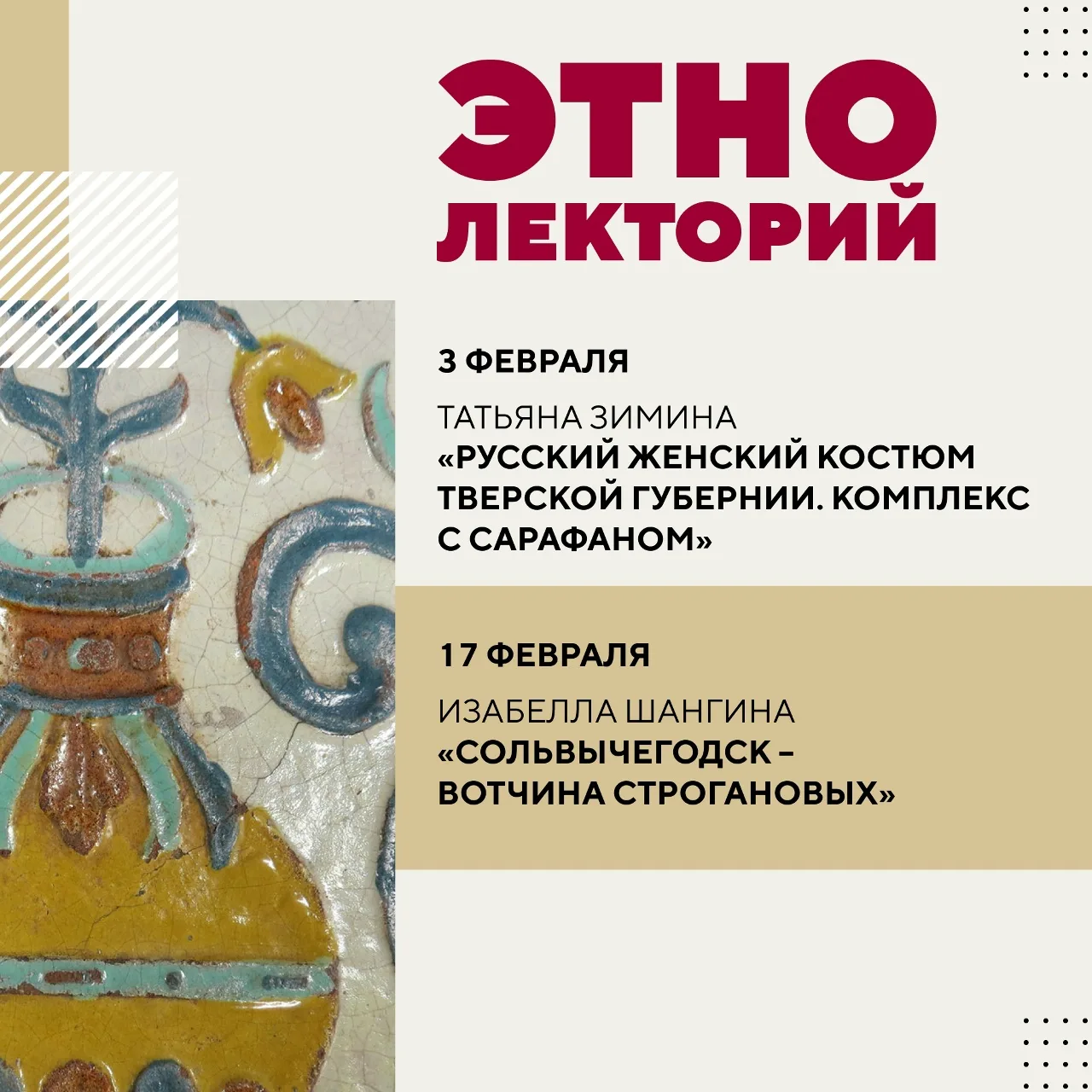 Первая лекция цикла, «Великий Устюг и его мастера: прошлое и настоящее», состоится уже 20 января. Мы углубимся в историю этого города, который был крупным центром торговли и ремёсел Русского государства, и узнаем о мастерах, принёсших Великому Устюгу особую славу. Лекцию проведёт Изабелла Шангина – доктор исторических наук, научный сотрудник отдела этнографии русского народа.
