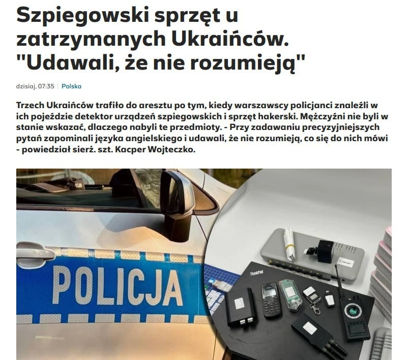 🗣По данным Polsat, задержанные не смогли внятно объяснить назначение аппаратуры: во время допроса путались в ответах и “забывали английский язык”. Они утверждают, что находились в Польше транзитом и направлялись в Литву.
