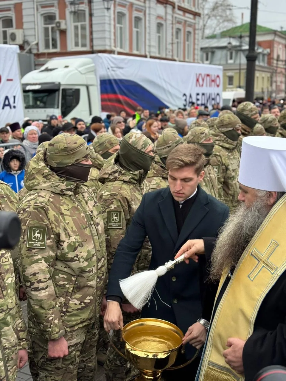 Каждому добровольцу лично пожал руку. Решительные и смелые люди, не боящиеся взглянуть смерти в лицо. В их честь на Ивановском съезде школьники развернули 100-метровое полотнище флага России. Митрополит, глава Духовного управления мусульман, руководитель еврейской общины благословили бойцов на подвиг.