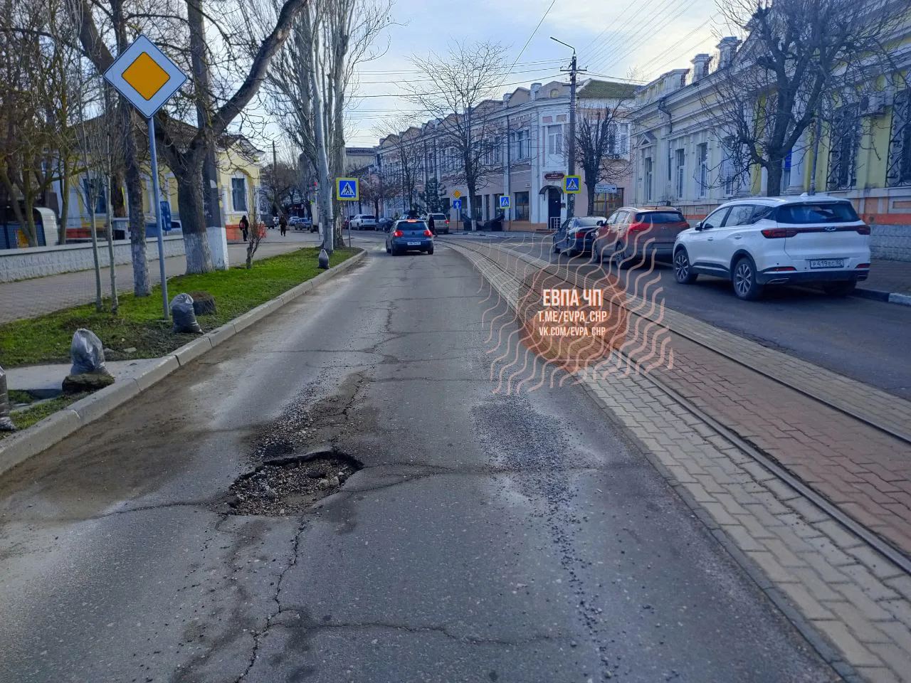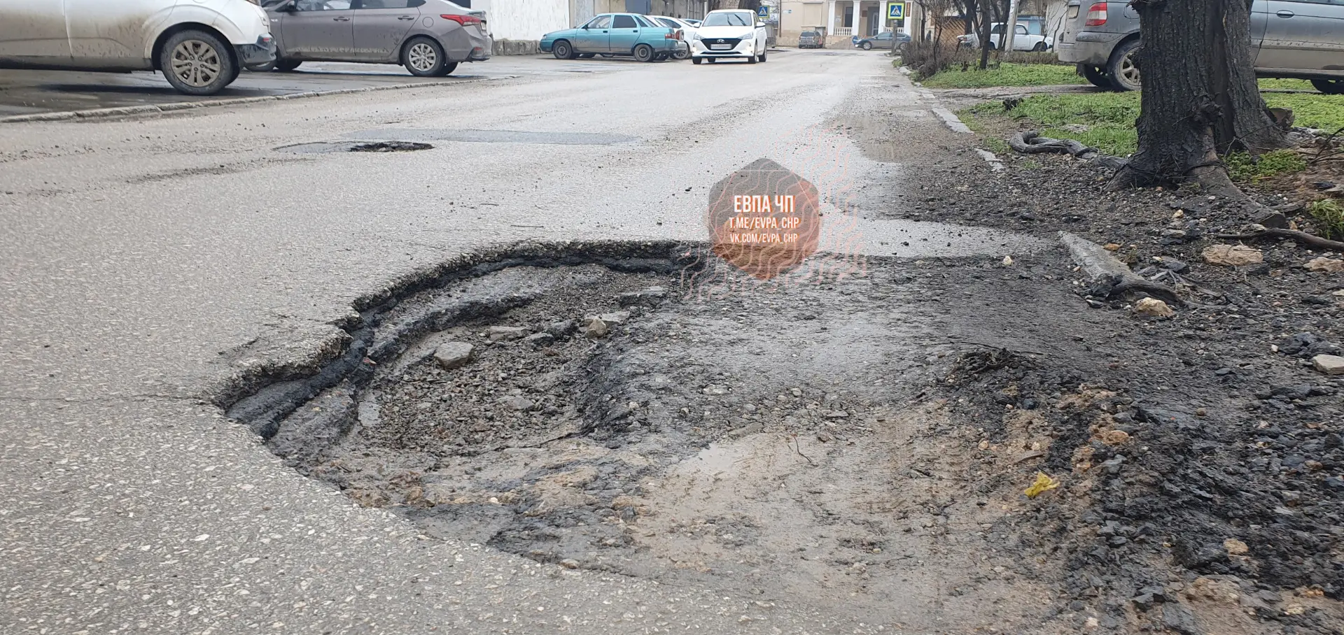 очень опасная яма особенно когда скрыта под дождем ☔️, чего ждём ? когда будет ДТП ?!