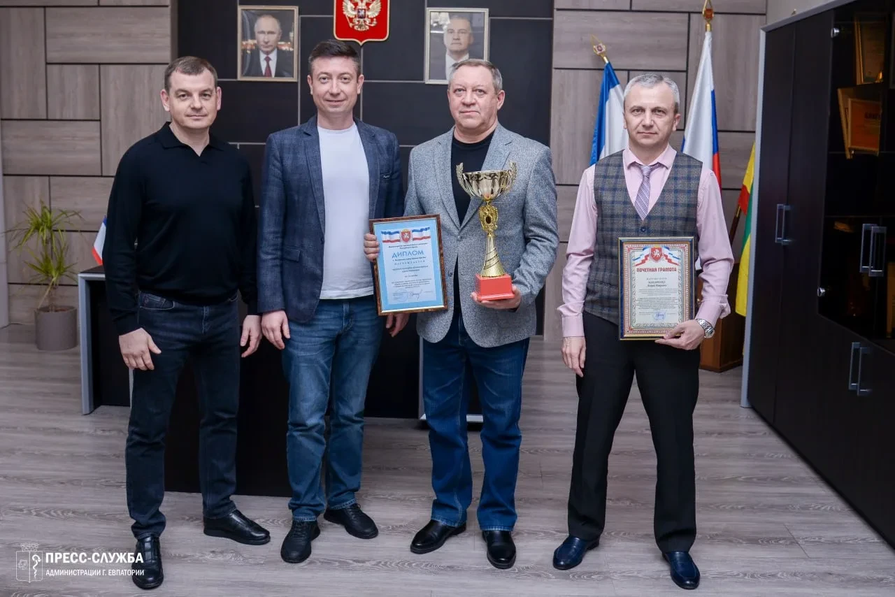 Первый заместитель главы администрации города Евпатории Антон Новиков и заместитель главы администрации Сергей Колганов поздравили начальника управления гражданской обороны и общественной безопасности администрации города Сергея Загребельского и заместителя начальника управления Андрея Макаренко с заслуженной победой – первым местом за выполнение мероприятий в области гражданской обороны и защиты населения от чрезвычайных ситуаций и по итогам работы за 2025 год.
