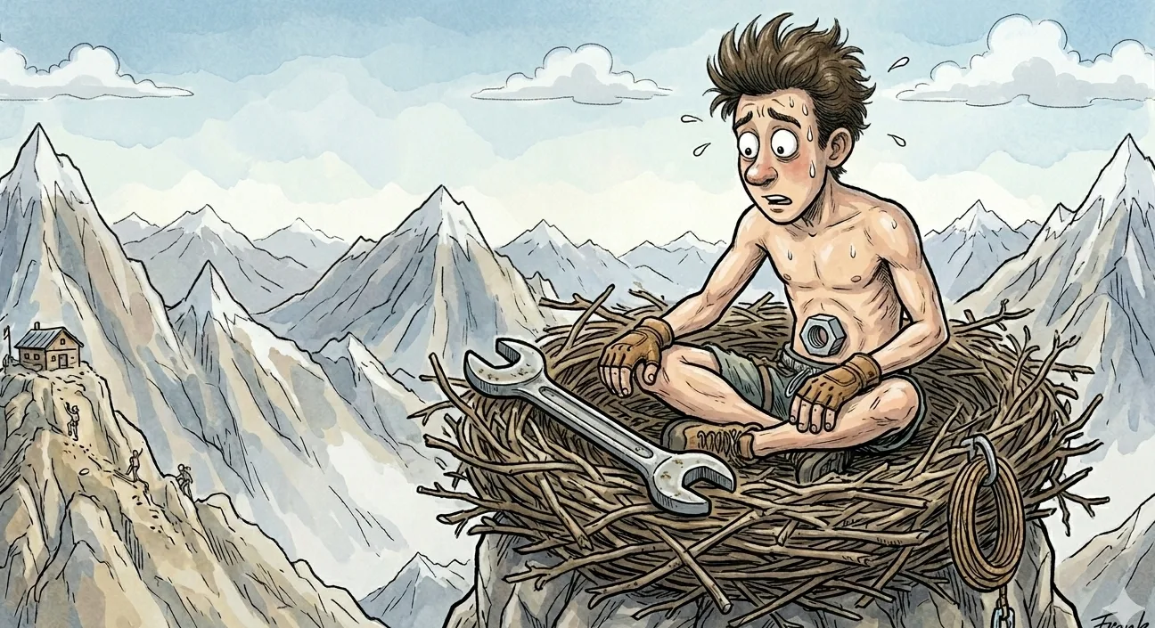 Мальчик полез на вершину скалы и когда забрался туда, то увидел орлиное гнездо, а в гнезде гаечный ключ. Тогда мальчик взял ключ и отвинтил свою гайку и у него...