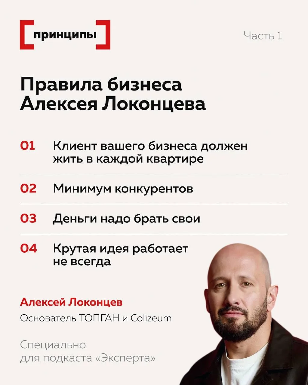 В видеоподкасте «Принципы» основатель ТОПГАН и Colizeum Алексей Локонцев обозначил правила успешного бизнеса, к которым он пришел после потери десятков проектов.