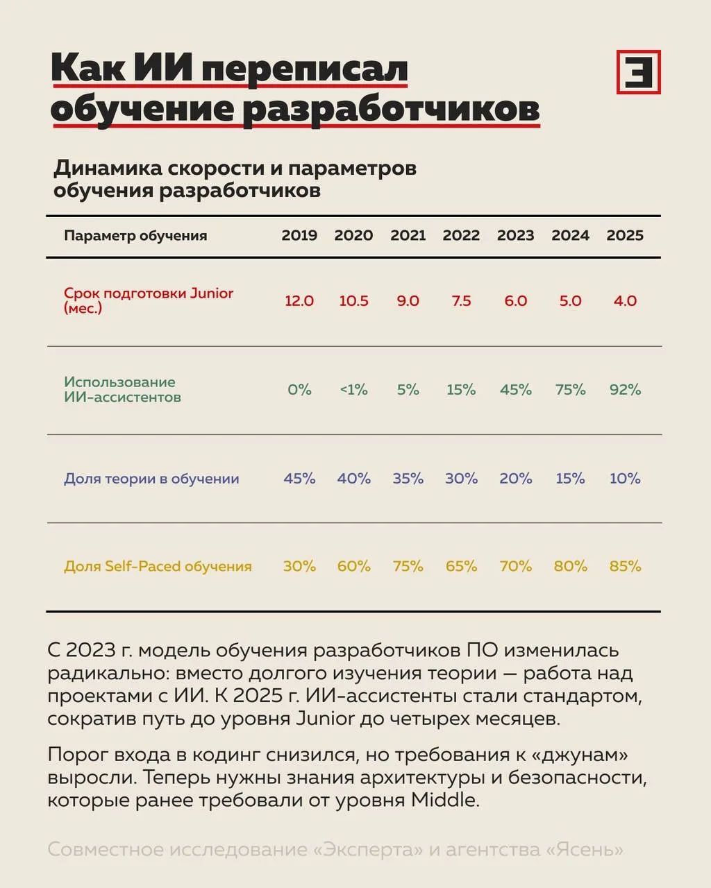 В итоге порог входа в профессию снижается, но вместе с тем растут требования к уровню компетенций уже на старте карьеры.