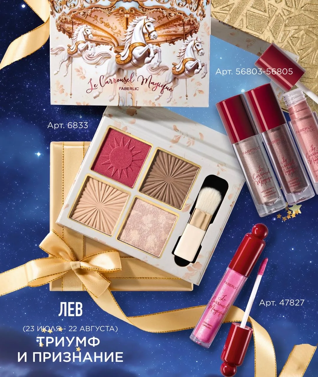 ♌️ Лев (23 июля – 22 августа) — набор коллекции Le Carrousel Magique: жидкие сияющие тени (арт. 56803 - 56805), палетка для лица (арт. 6833) и блеск для губ (арт. 46827) — для королевского сияния.