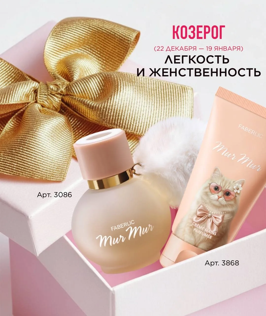 ♑️ Козерог (22 декабря – 19 января) — парфюмированный крем для рук (арт. 3868) и парфюмерная вода Mur Mur (арт. 3086) — для игривого настроения со сладостью кокоса.