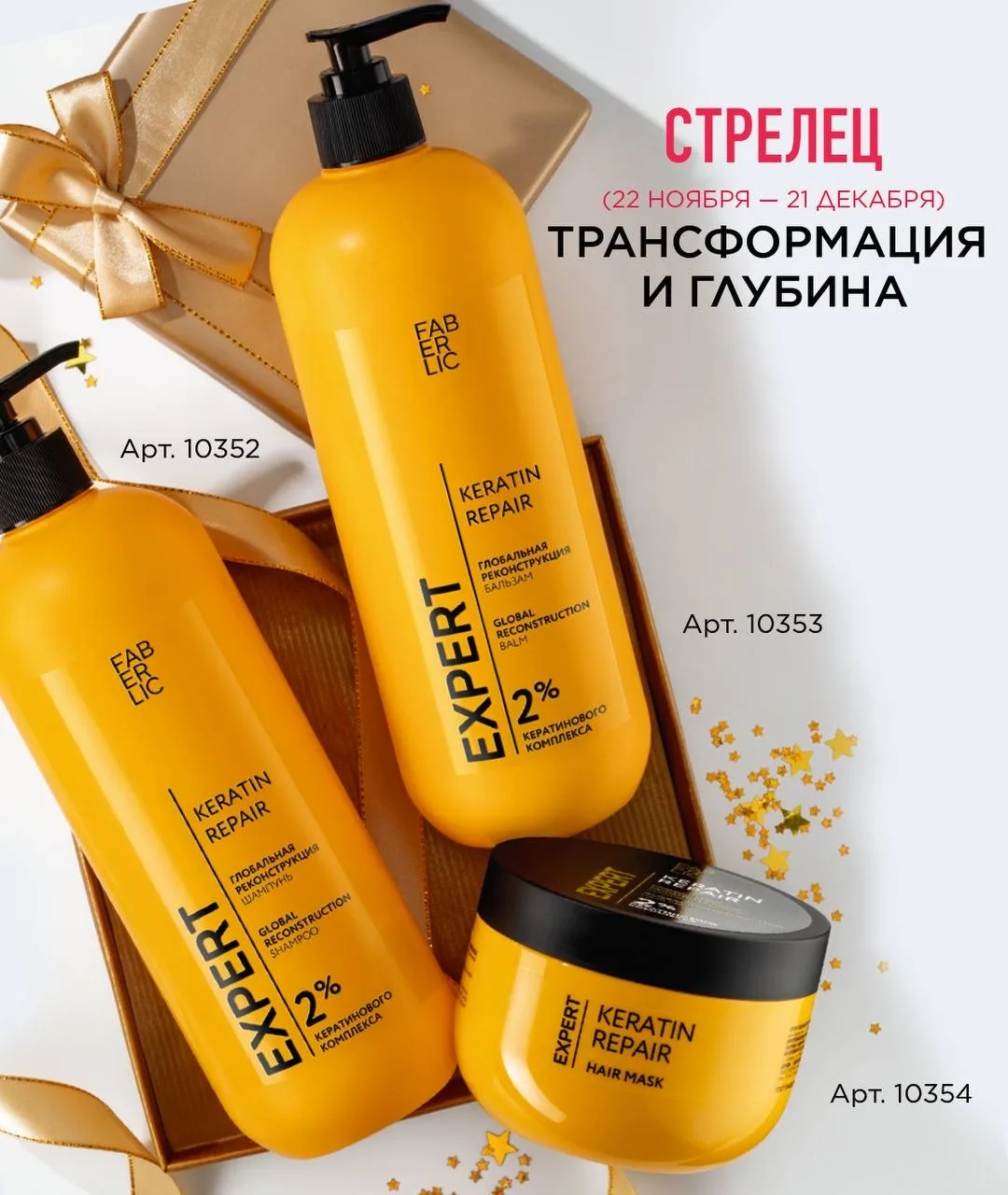 ♐️ Стрелец (22 ноября – 21 декабря) — трио для волос Keratin Repair Expert Hair: шампунь (арт. 10352), бальзам (арт. 10353), маска (арт.10354) — для восстановления и сияния локонов.