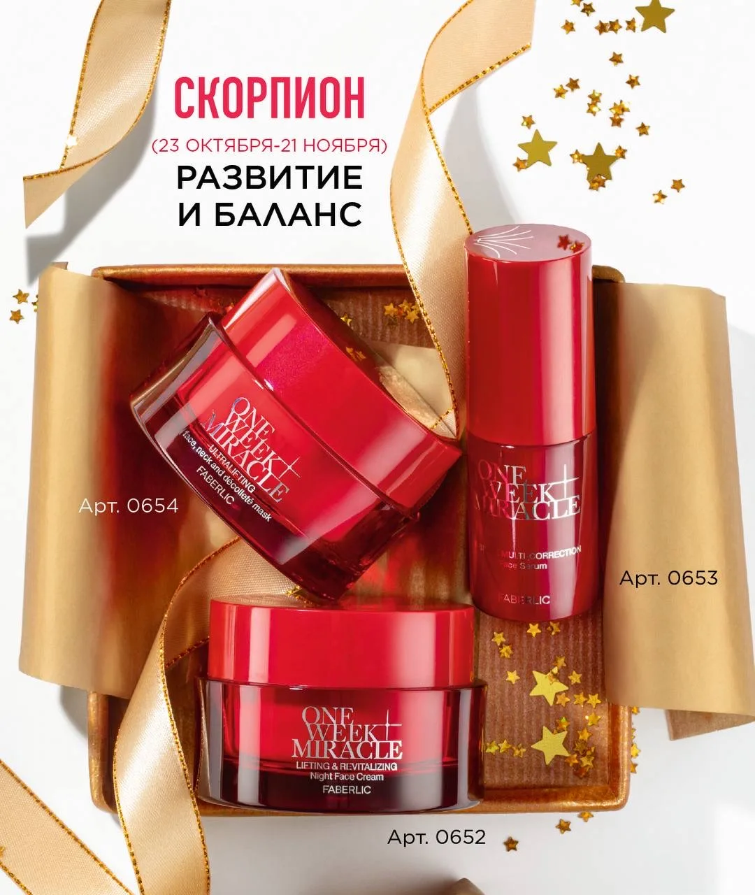 ♏️ Скорпион (23 октября – 21 ноября) — маска для лица, шеи и декольте (арт. 0654), сыворотка для лица (арт. 0653) и ночной крем (арт. 0652) из серии One Week Miracle — для глубокого преображения и заботы о коже.