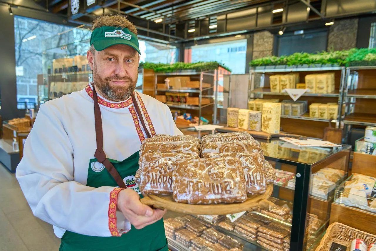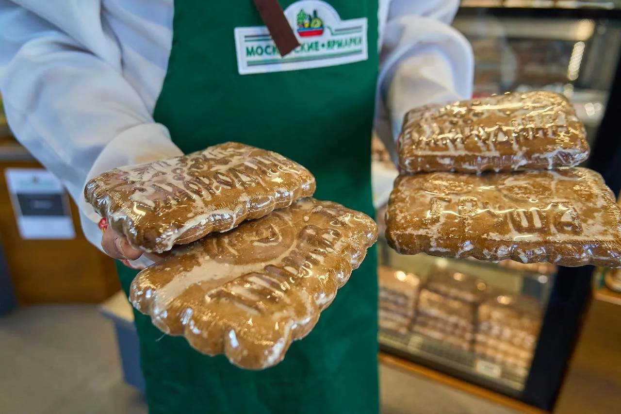 Пекут его по старинной технологии: тесто на меде и патоке, рисунок «вбивают» вручную в резные доски, а из печи он выходит румяный, с хрустящей корочкой и ароматом, который чувствуется за пару рядов.