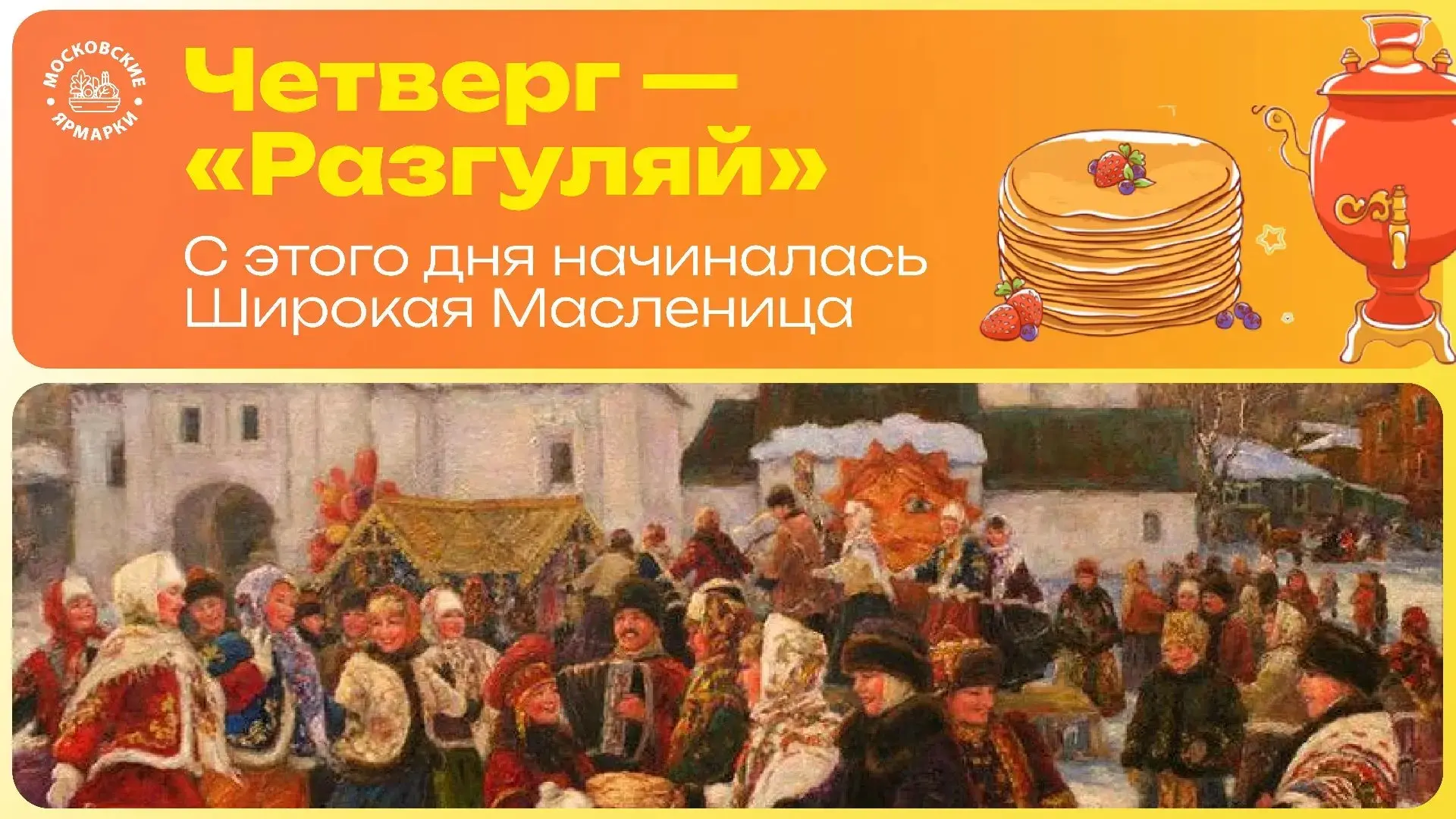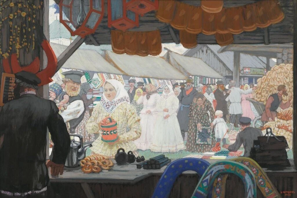 писали ярмарки с натуры — с шумом, торгом, смехом, блинами и пёстрыми прилавками.