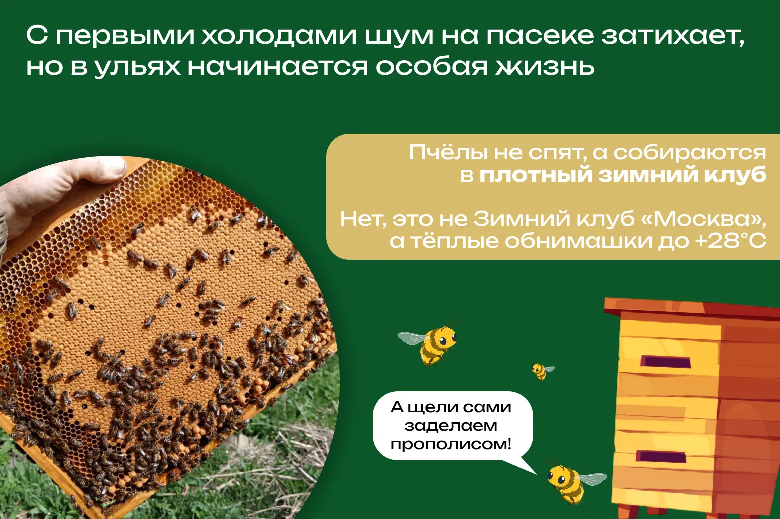 Нет, даже на январских праздниках эти маленькие труженики не расслабляются и не уходят в спячку. Пчелиное семейство греет друг-друга, а пасечники всю осень готовят ульи к зимовке 🍯
