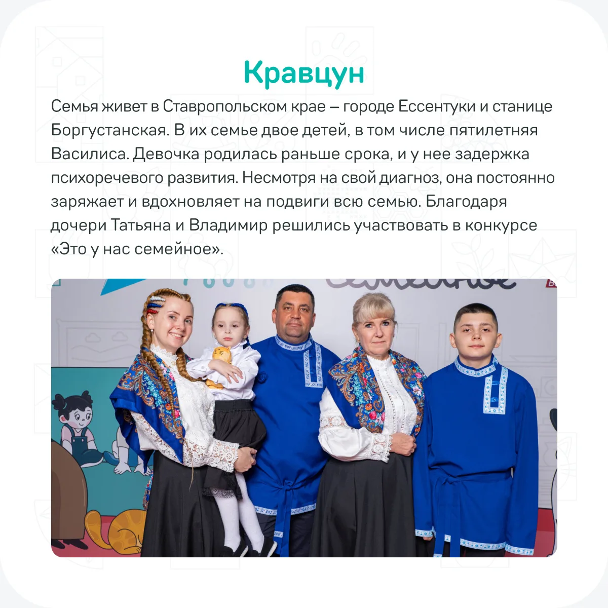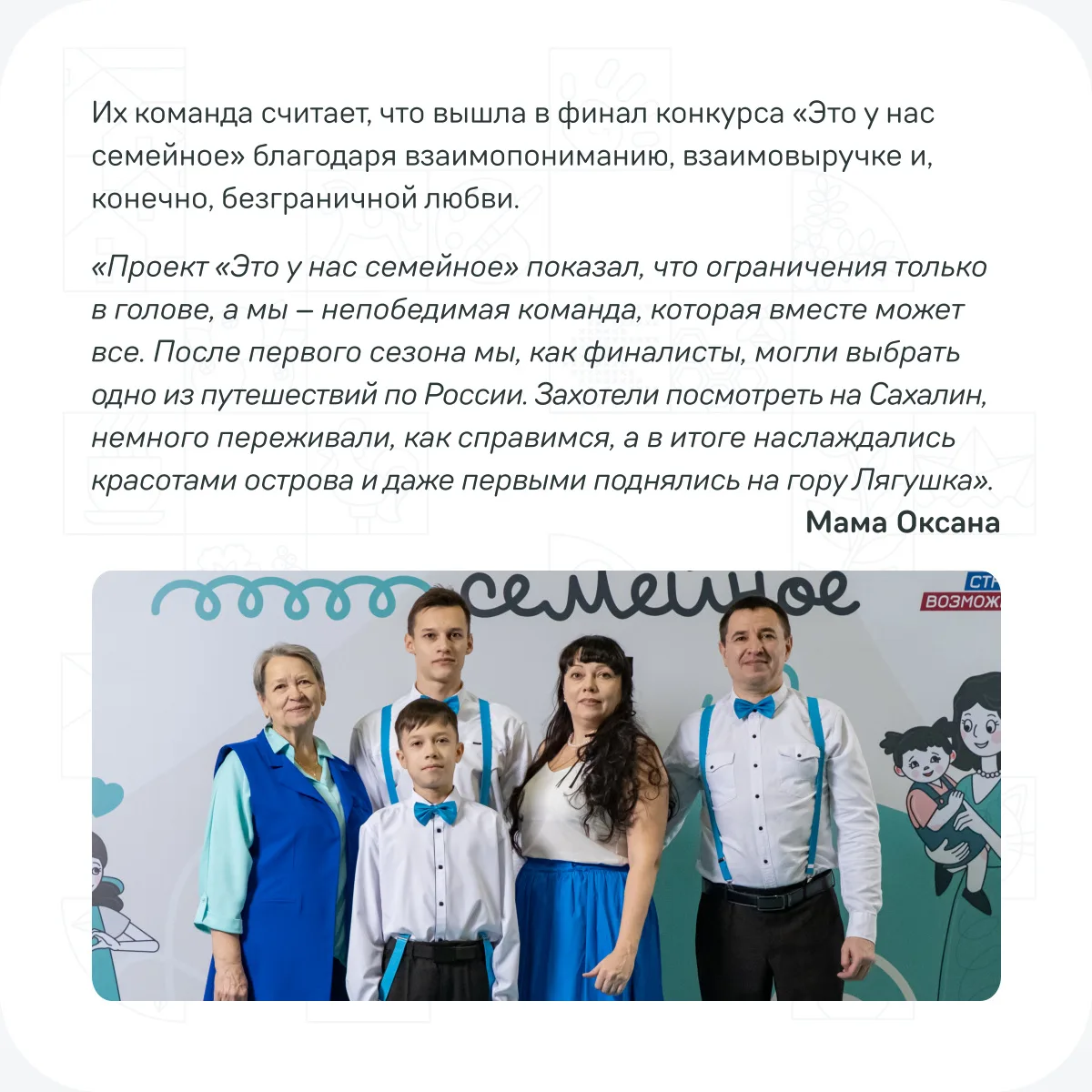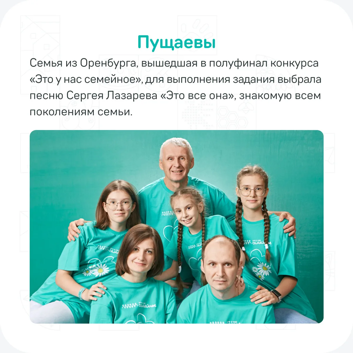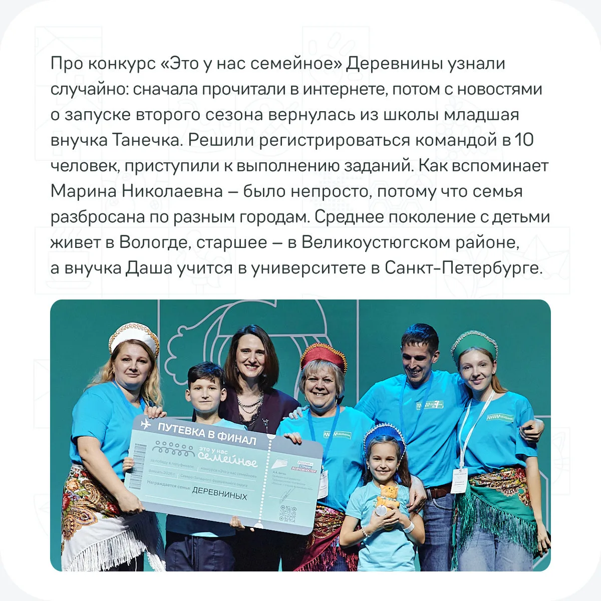 Среди полуфиналистов и победителей прошедших полуфиналов конкурса «Это у нас семейное» есть удивительные семьи, для которых поддержка друг друга стала не просто ценностью, а ежедневной опорой. Они участвуют в проекте не ради побед, а ради ярких эмоций, новых впечатлений и возможности быть частью большого дружного сообщества 👥