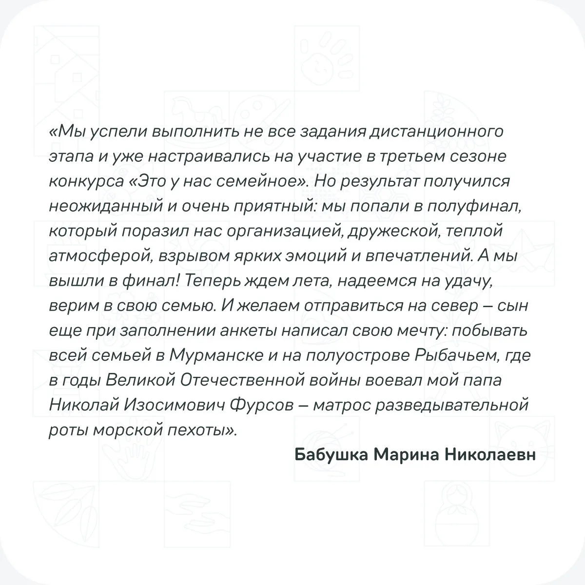 В семейном аккаунте доступно новое дополнительное задание для участников полуфиналов конкурса «Это у нас семейное» ✨