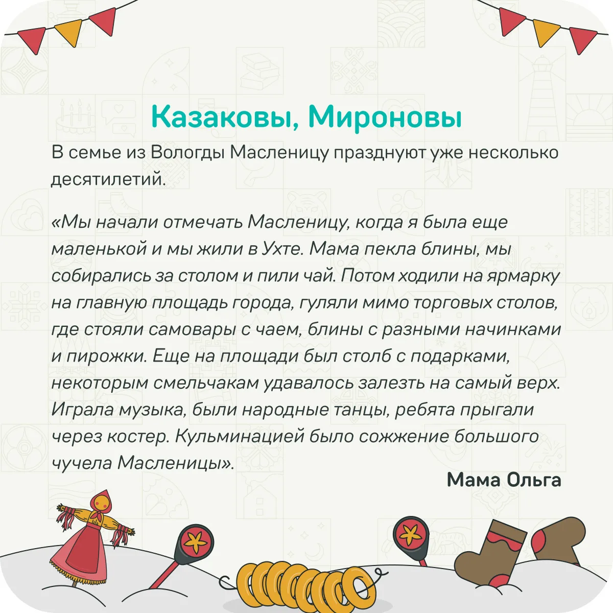По всей России сейчас провожают зиму: пекут блины, гуляют, обнимаются и встречают гостей. У каждой семьи — свои традиции. Где-то передают из поколения в поколение рецепт тонких кружевных блинчиков, где-то всей семьей строят крепость, а где-то папа каждый год мастерит чучело.
