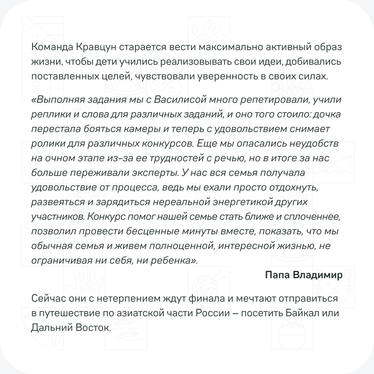 В преддверии полуфиналов 2026 года мы пообщались с семейными командами, которые уже успешно справились с очными заданиями в 2025 году. Они поделились, как готовились, и дали несколько советов. Среди рекомендаций — сохранять спокойствие, верить в удачу и брать с собой талисман, но самое главное — настроиться на большое приключение для всей семьи 💫