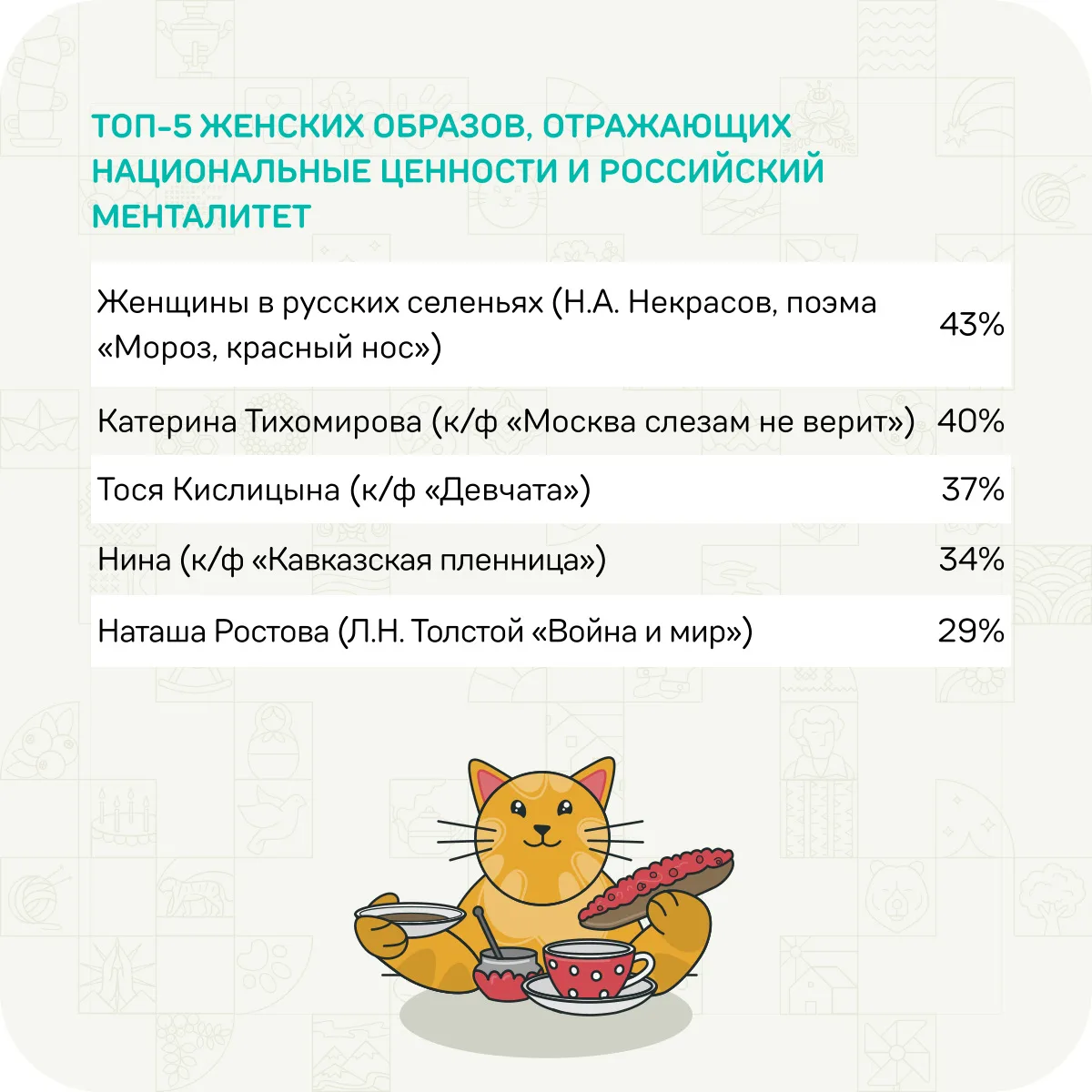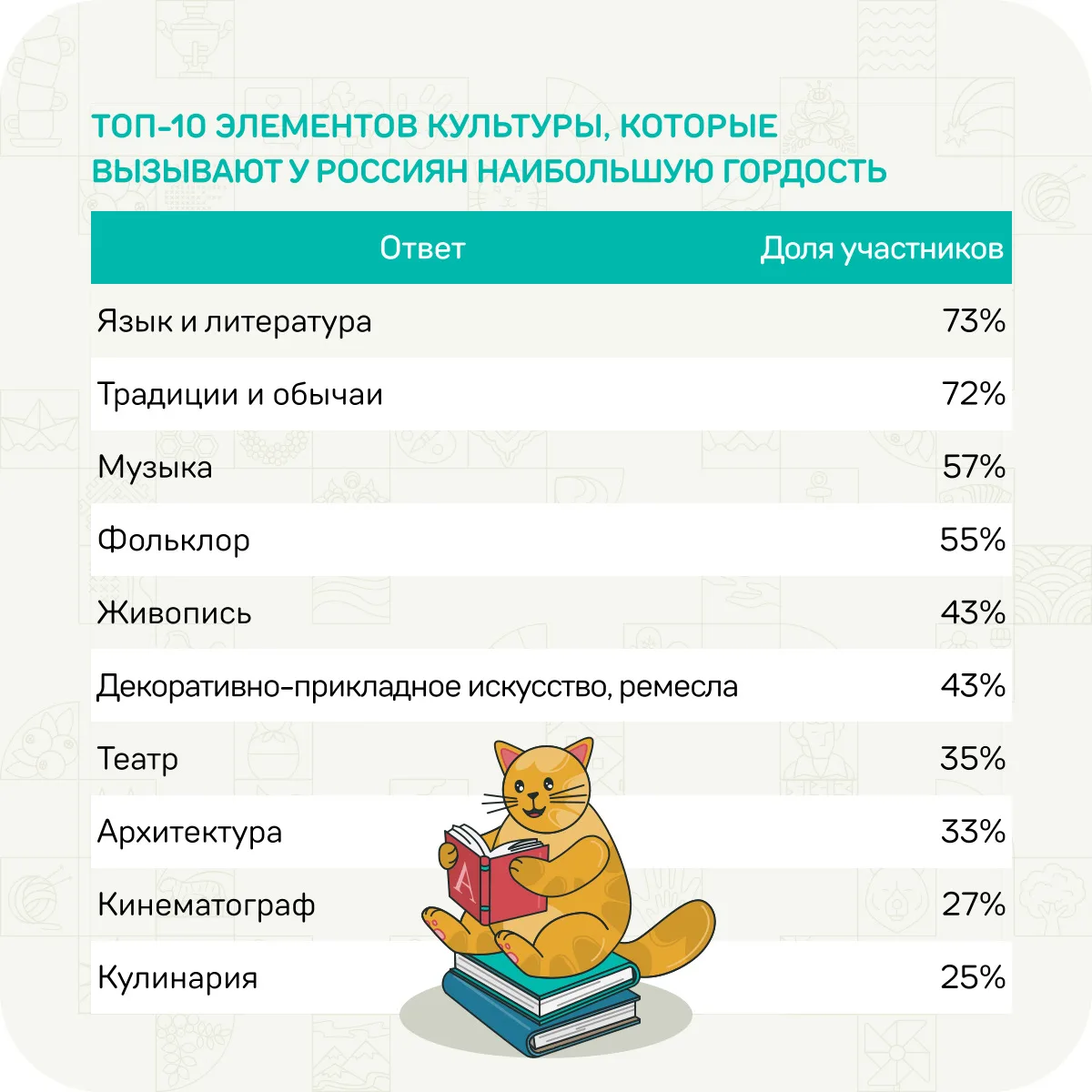Респонденты рассказали, с какими литературными и кинематографическими образами себя ассоциируют, какими достижениями страны, российских и советских деятелей науки, культуры и искусства больше всего гордятся.