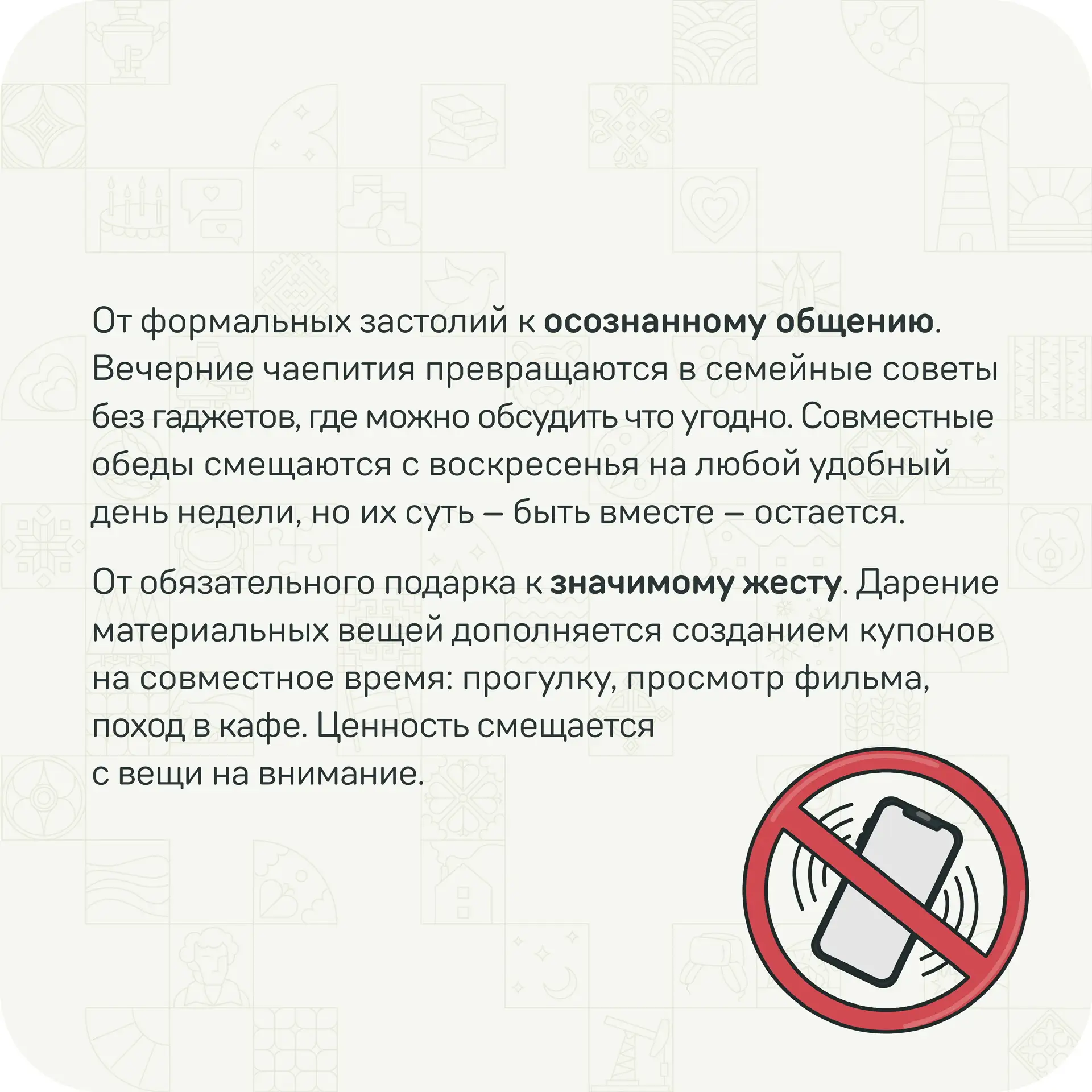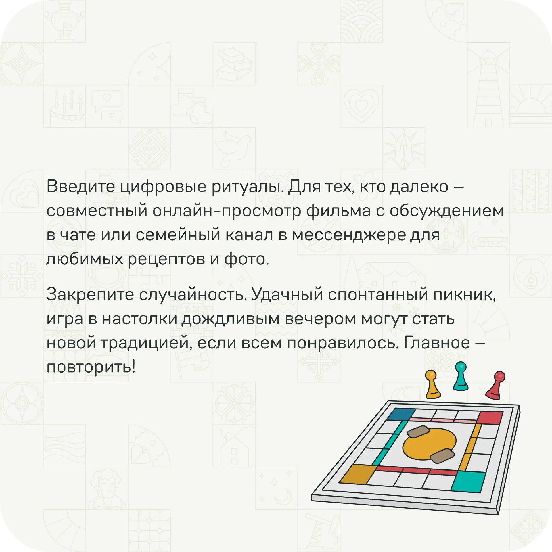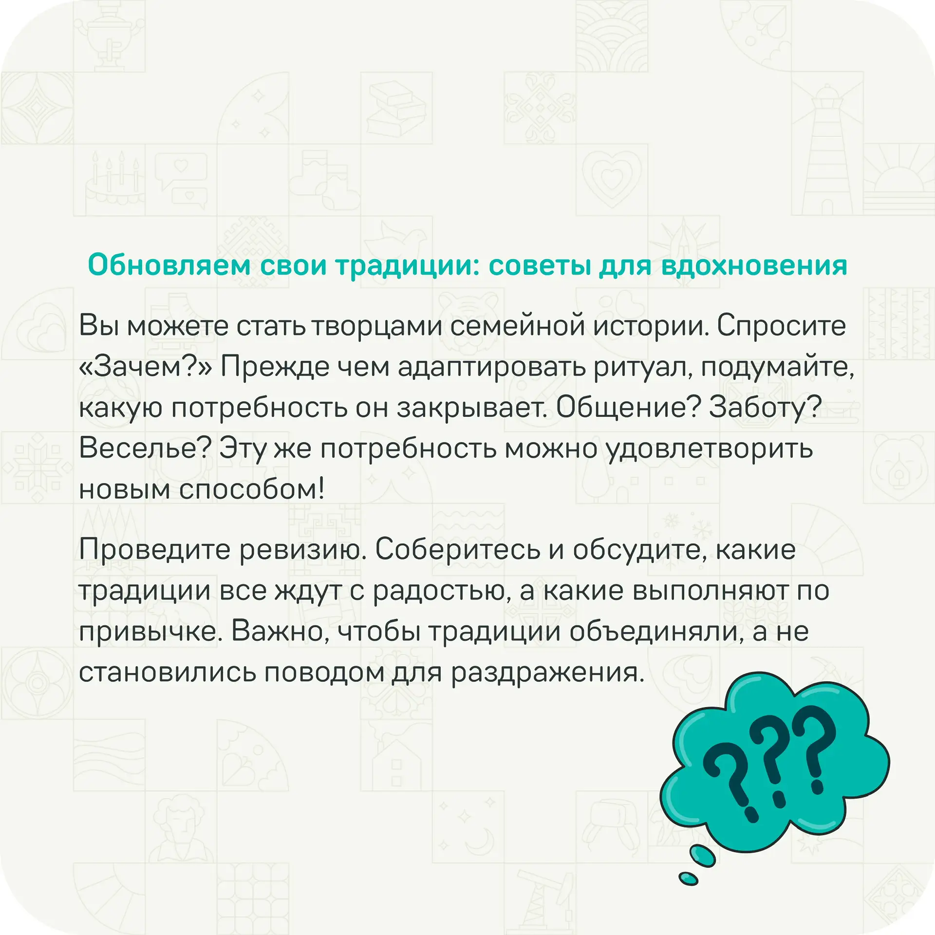 Многие семьи хранят и передают интересные традиции этого дня. Сегодня в карточках рассказываем о некоторых из них! Приятного изучения 😌