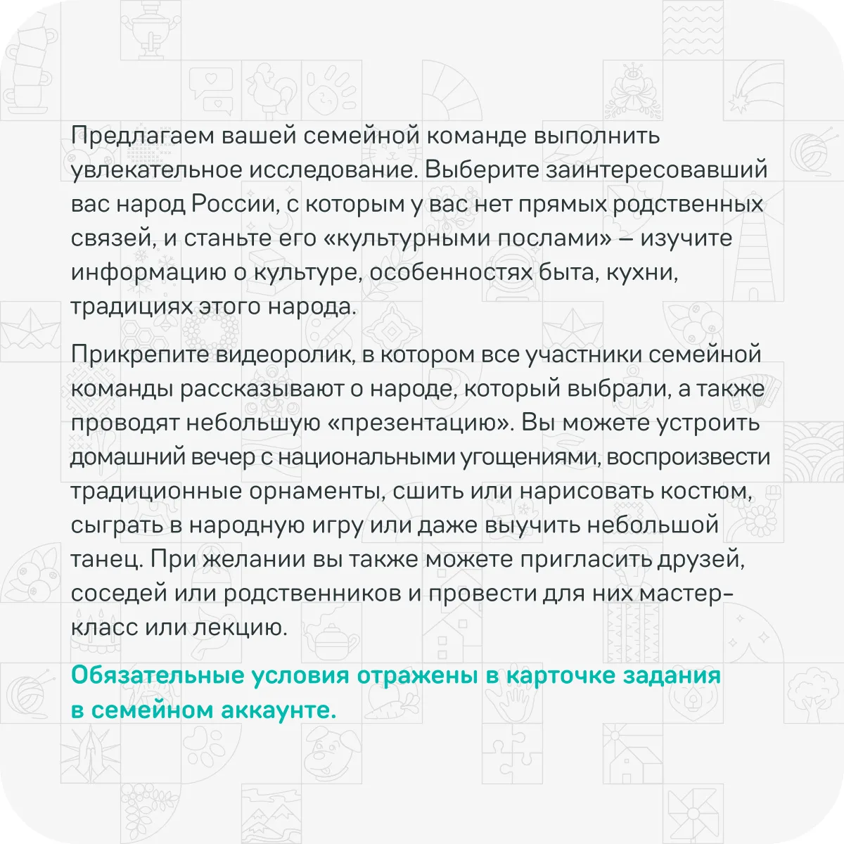 В России живут десятки народов, и у каждого — свой язык, свои традиции, своя уникальная история. Мы предлагаем вашей семье стать настоящими исследователями и «культурными послами» одного из народов России. Выберите тот, с которым у вас нет прямых родственных связей, и погрузитесь в его мир — с уважением, интересом и любовью.