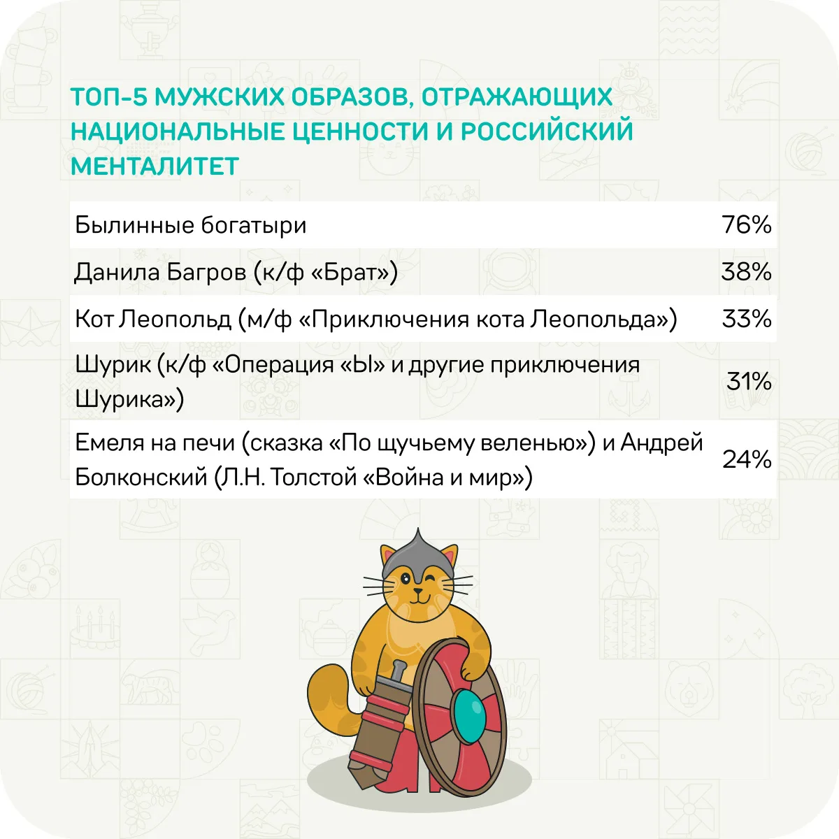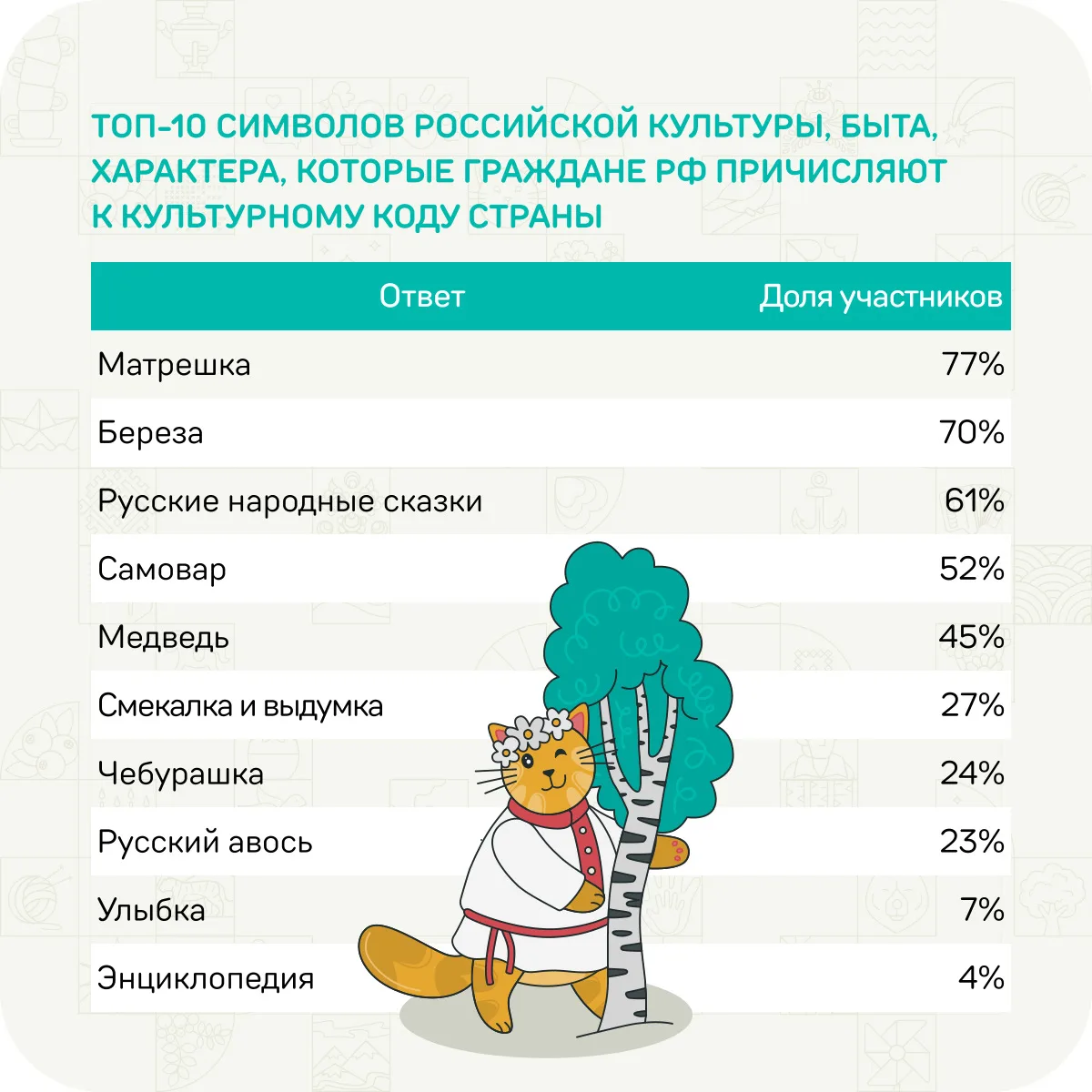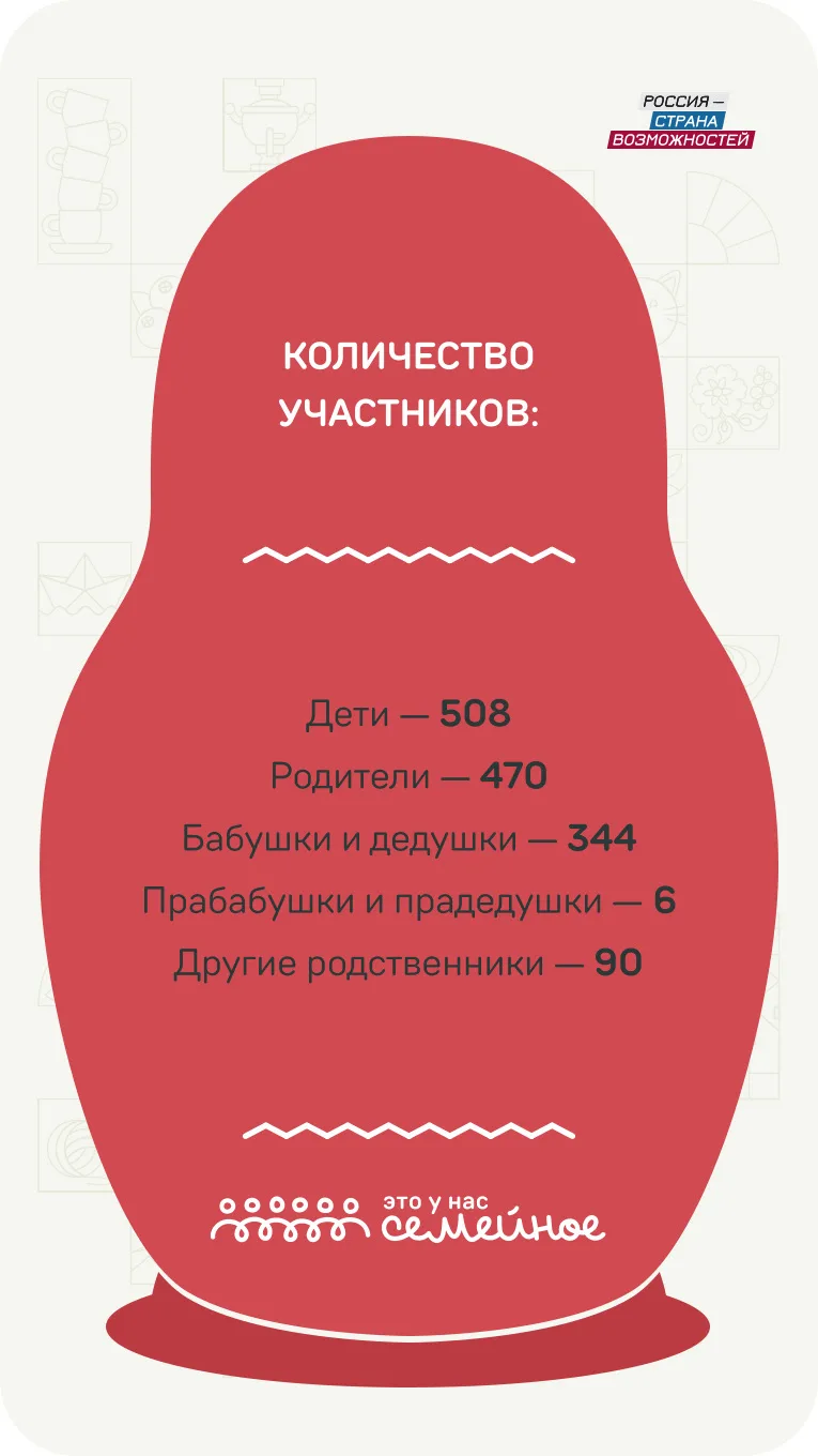 Более 4500 семей-участников в ходе исследования, проведенного конкурсом «Это у нас семейное», поделились своими ассоциациями: от былинных богатырей и берез до первого полета в космос и современных научных побед 🚀