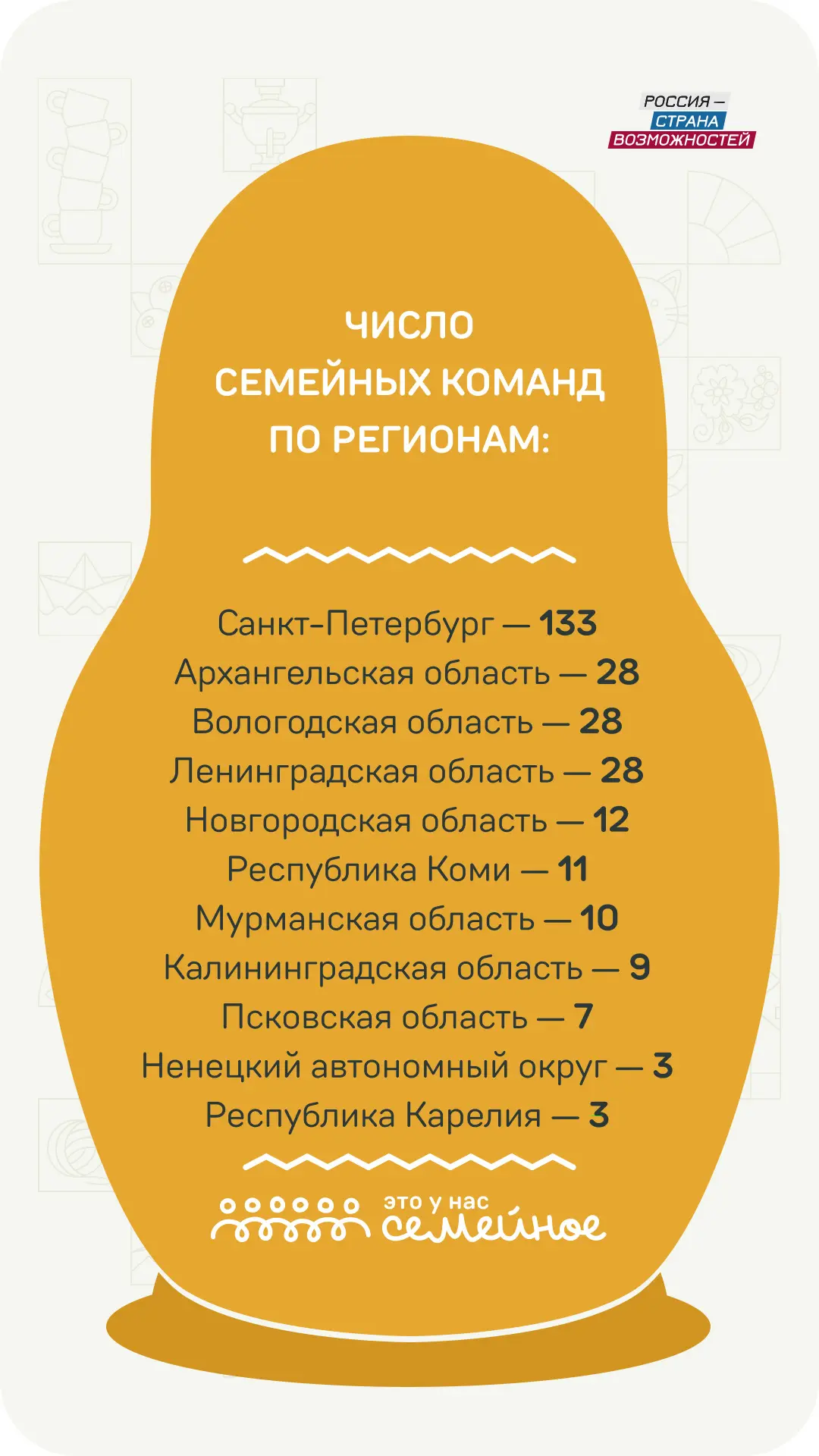 53 cемейные команды из 11 регионов Северо-Западного федерального округа с успехом выполнили серию творческих, спортивных и интеллектуальных заданий и получили заветную путевку в финал конкурса «Это у нас семейное» 🤩