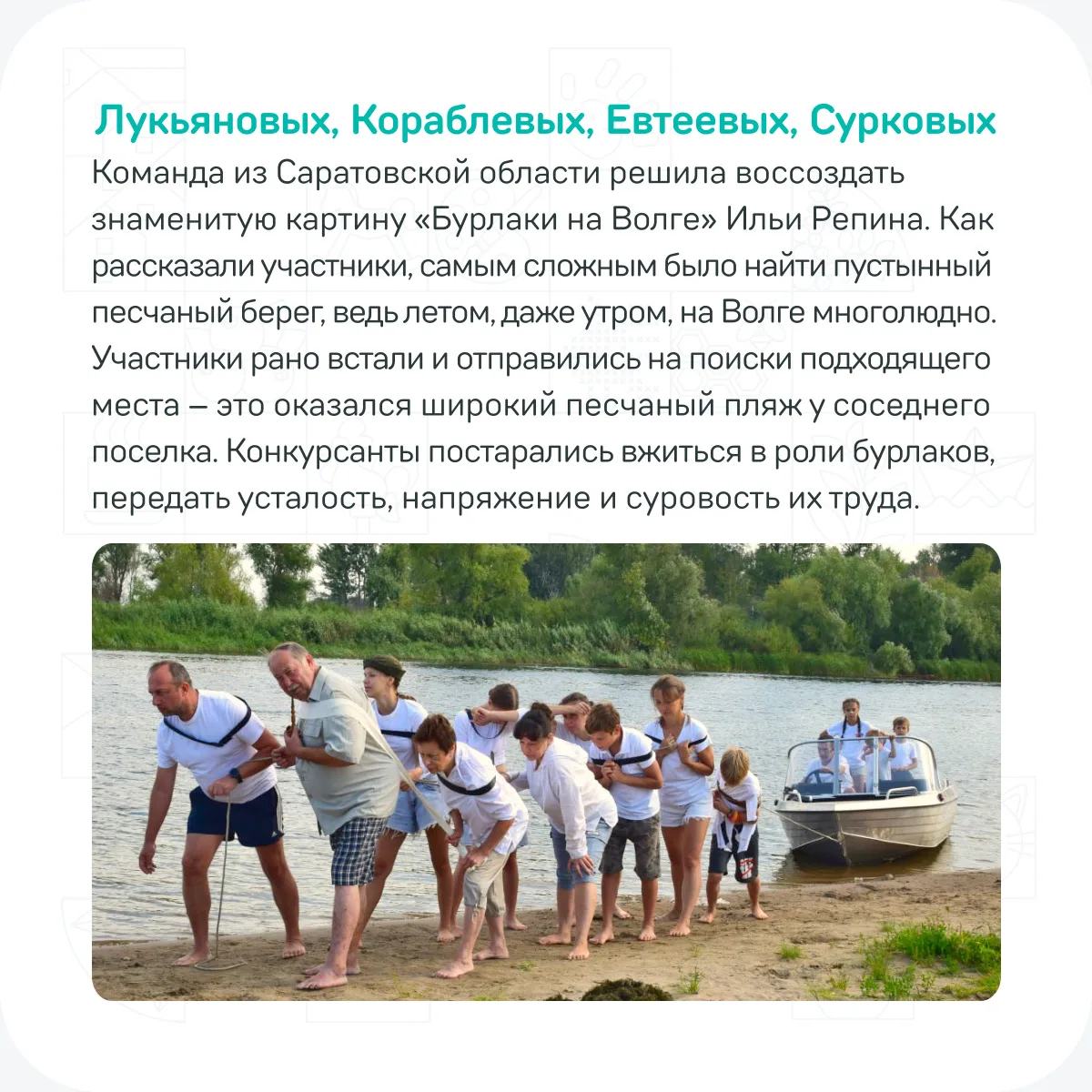 Семьи должны были воссоздать сюжеты знаменитых русских картин — от «Боярыни Морозовой» до «Бурлаков на Волге». Конкурсанты подошли к делу с фантазией: костюмы, грим, точные позы и даже домашние декорации 🤩