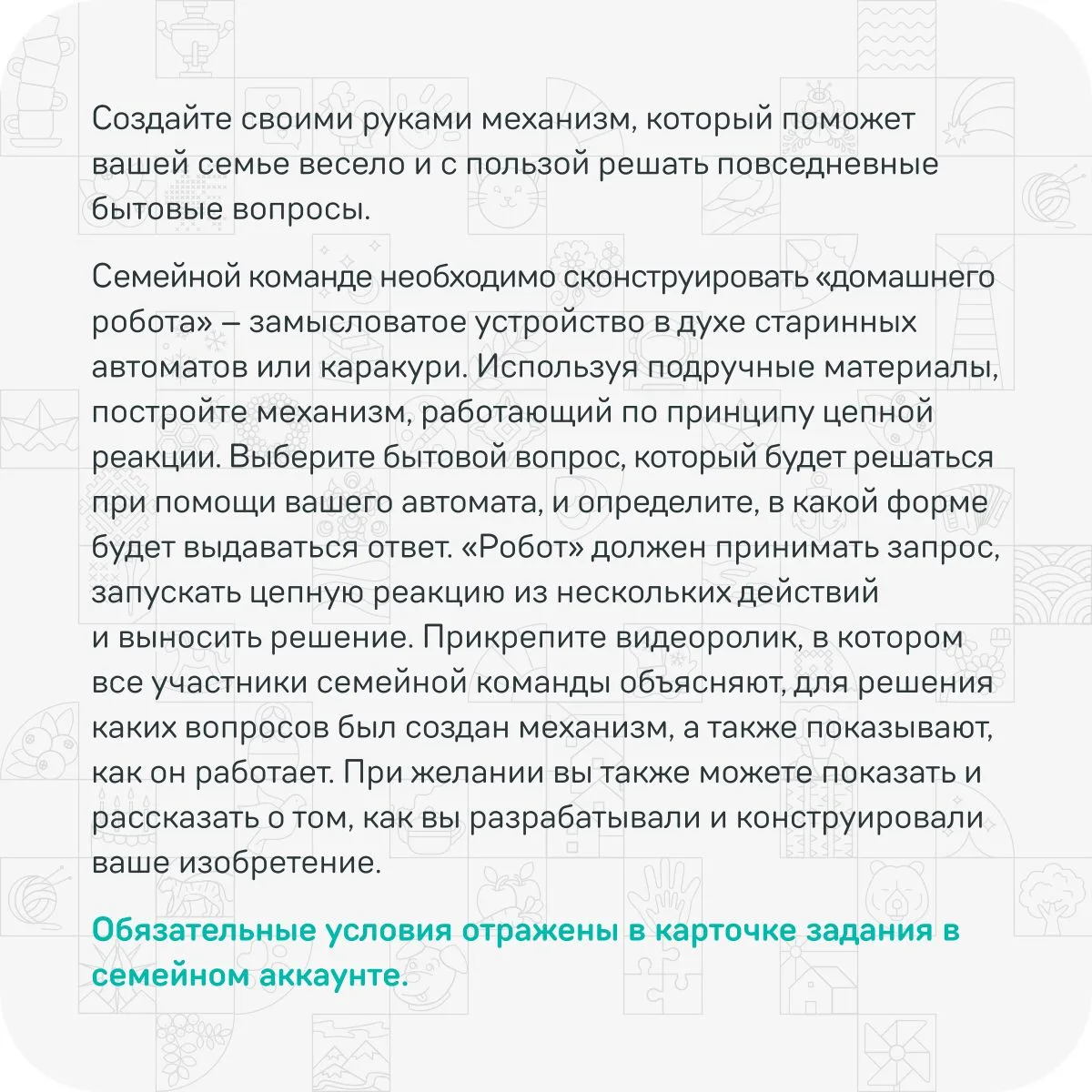Создайте «домашнего робота», который с помощью цепной реакции разрешит любой семейный спор! Чем больше последовательных стадий и неожиданных действий — тем интереснее. Пусть это будет не только полезный помощник, но и прекрасный повод для всей семьи собраться за общим проектом ❤️