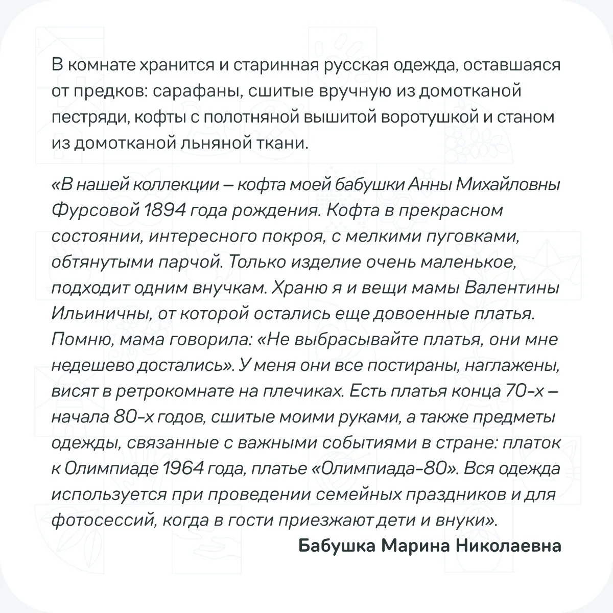 Семья Деревниных из Вологодской области превратила комнату в настоящий ретромузей: старинная мебель, винтажная одежда, прялка прабабушек и даже платок к Олимпиаде 1964 года.