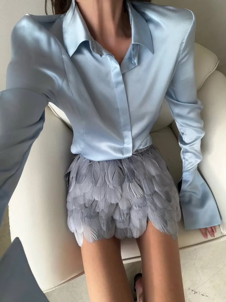 Мини-юбка из голубых перьев от mesh n flash прооооосто незаконно красивая. Рубашка, кстати, мне тоже очень нравится.