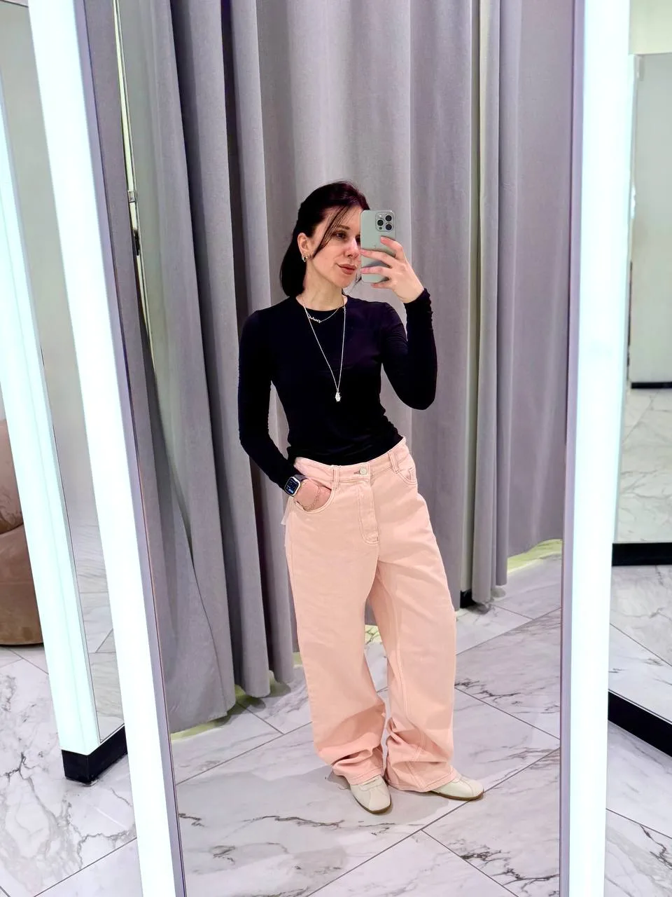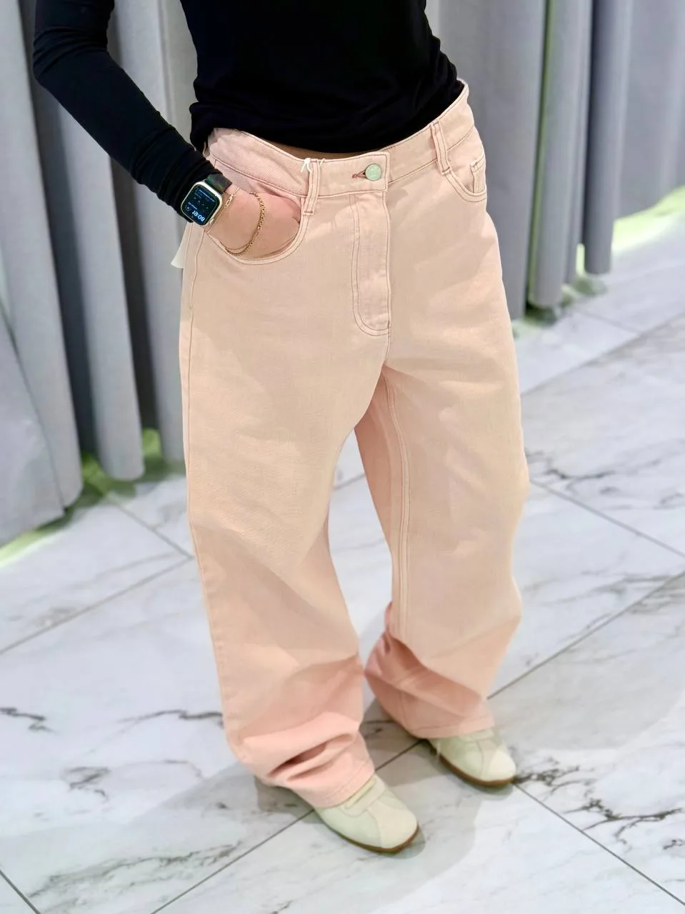 Касательно посадки - она высокая, но если у вас большой перепад между бедрами и талией, то они не сядут. Достаточно прямой пошив. Рекомендую либо сажать их на среднюю, либо как я на низкую.