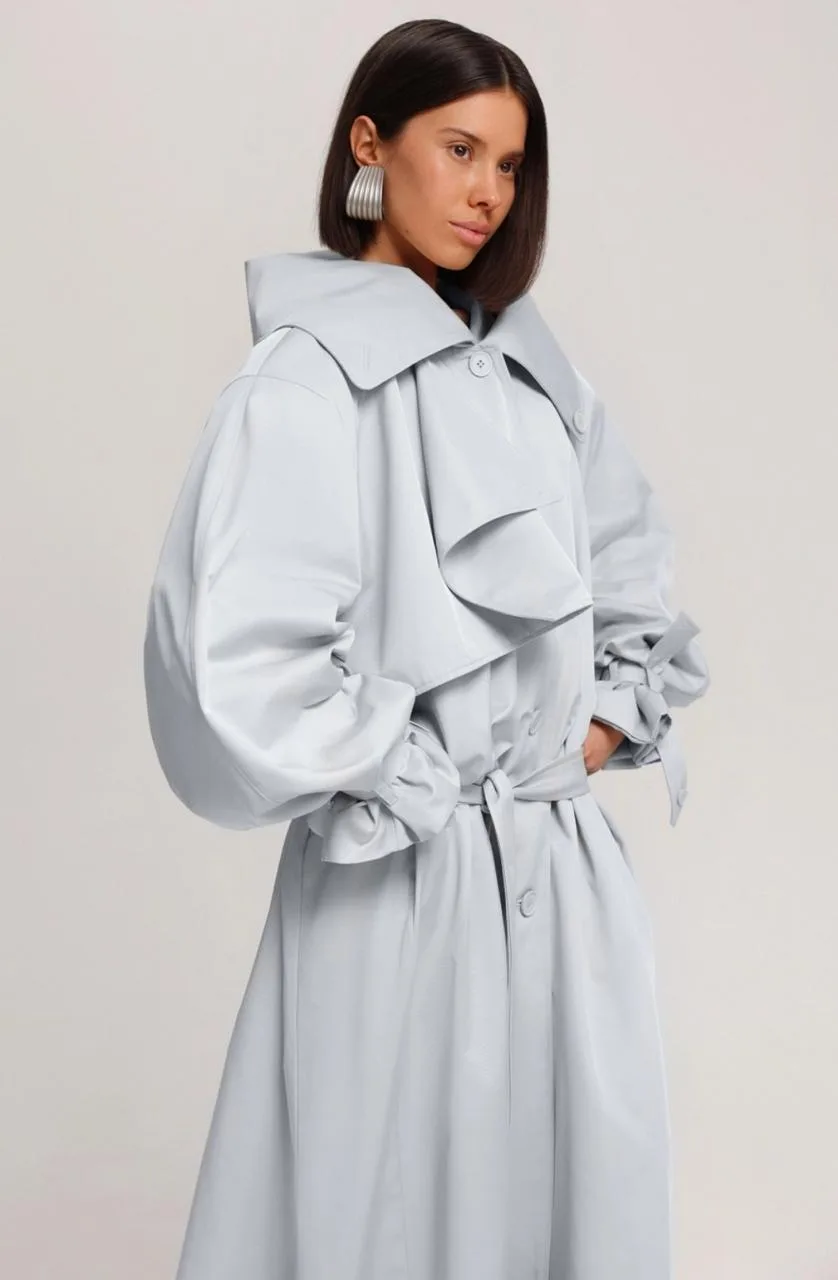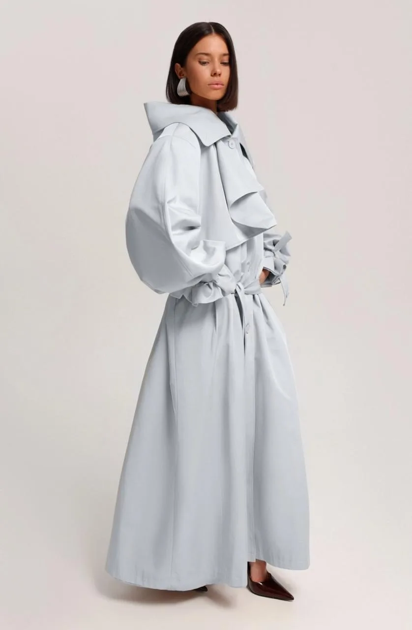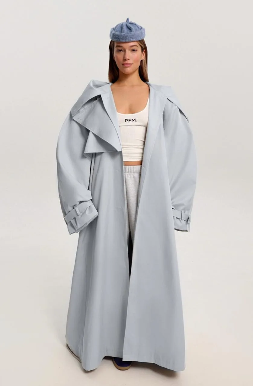 Небесно-голубой тренч в макси длине с заниженной талией