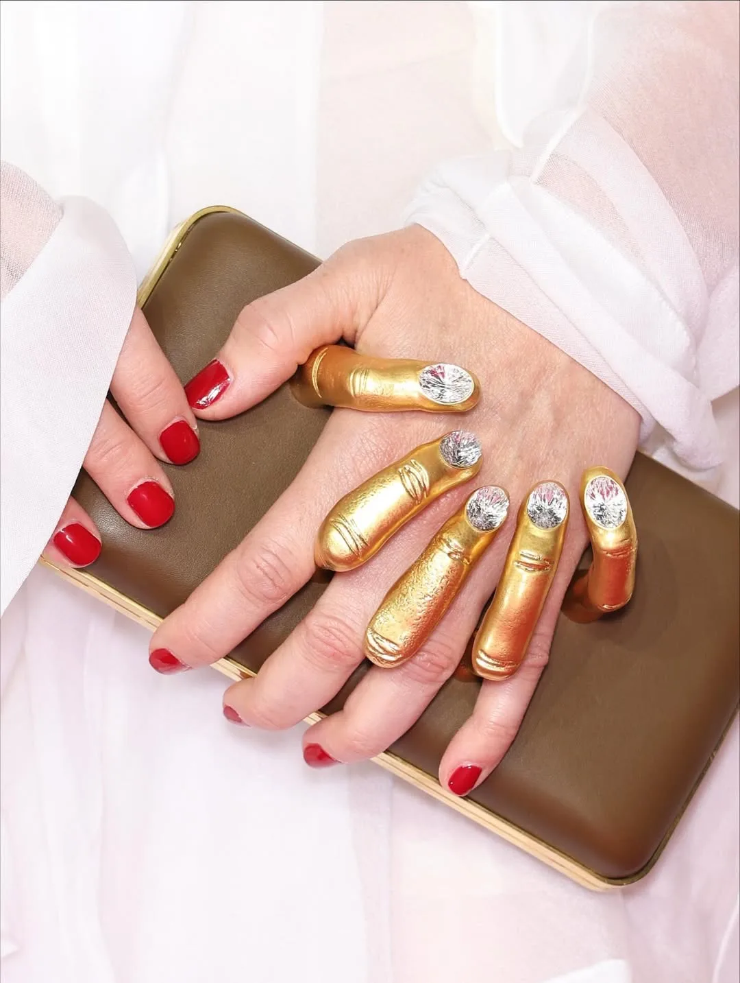 Это фулл-лук от Schiaparelli, и просто посмотрите на детали: светящееся ожерелье с последнего показа и просто гениальный клатчик!