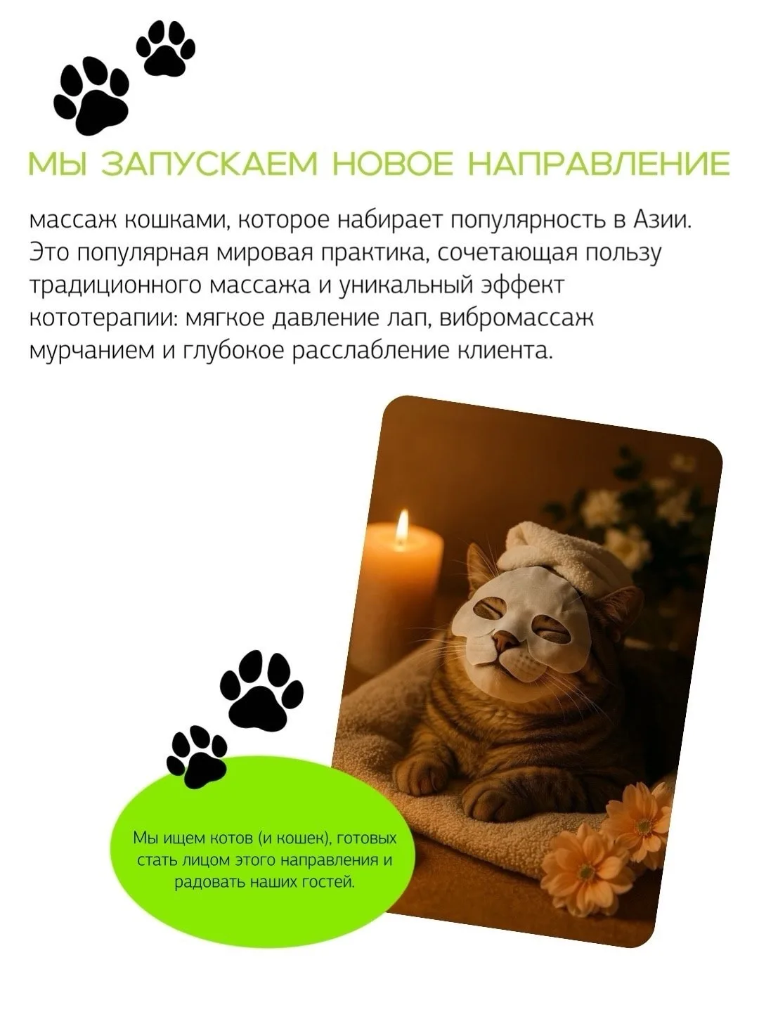 Должностные обязанности: массаж, мурчание для фона и съёмки для соцсетей. Хозяину – скидка на все услуги студии!