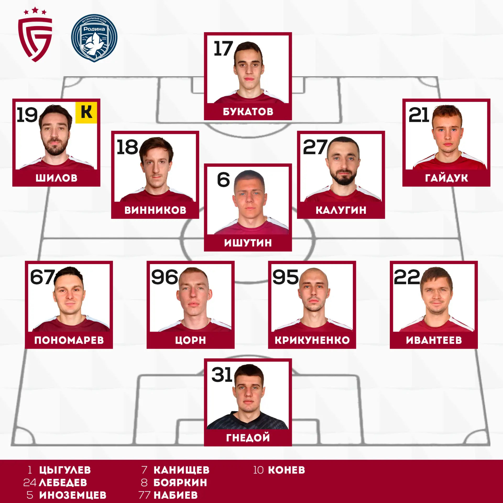 Гнедой, Крикуненко, Цорн, Пономарев, Ивантеев, Ишутин, Винников, Калугин, Шилов (К), Гайдук, Букатов.