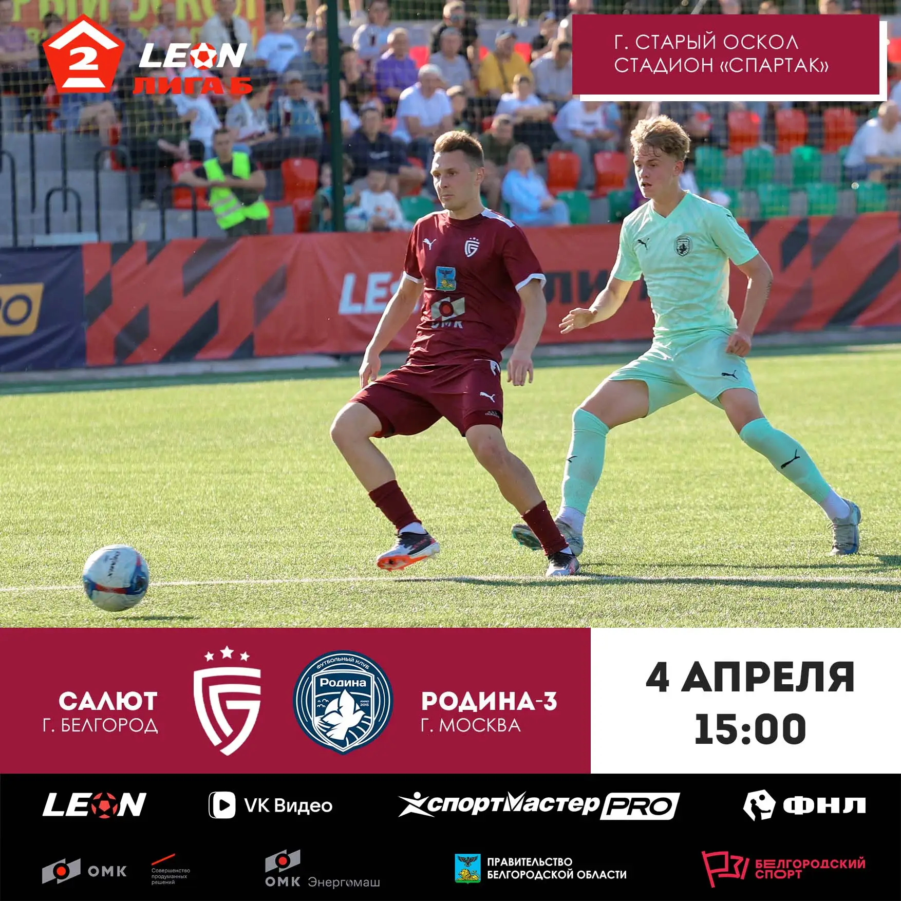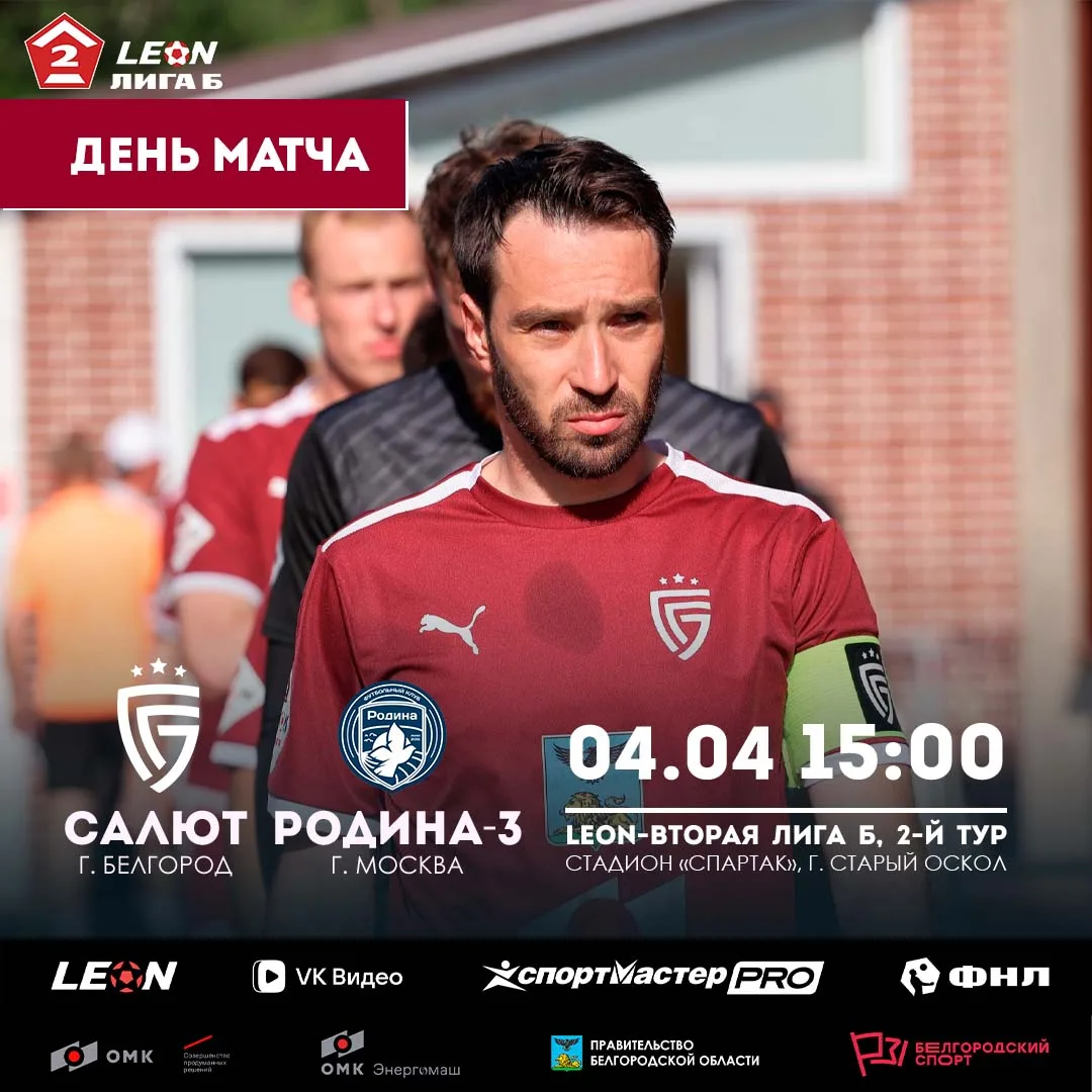 💥 Первый домашний матч сезона! 4 апреля «Салют» сыграет с «Родиной-3». Игра 2-го тура LEON-Первенства Второй лиги Б пройдёт в Старом Осколе на стадионе «Спартак». Начало в 15:00.