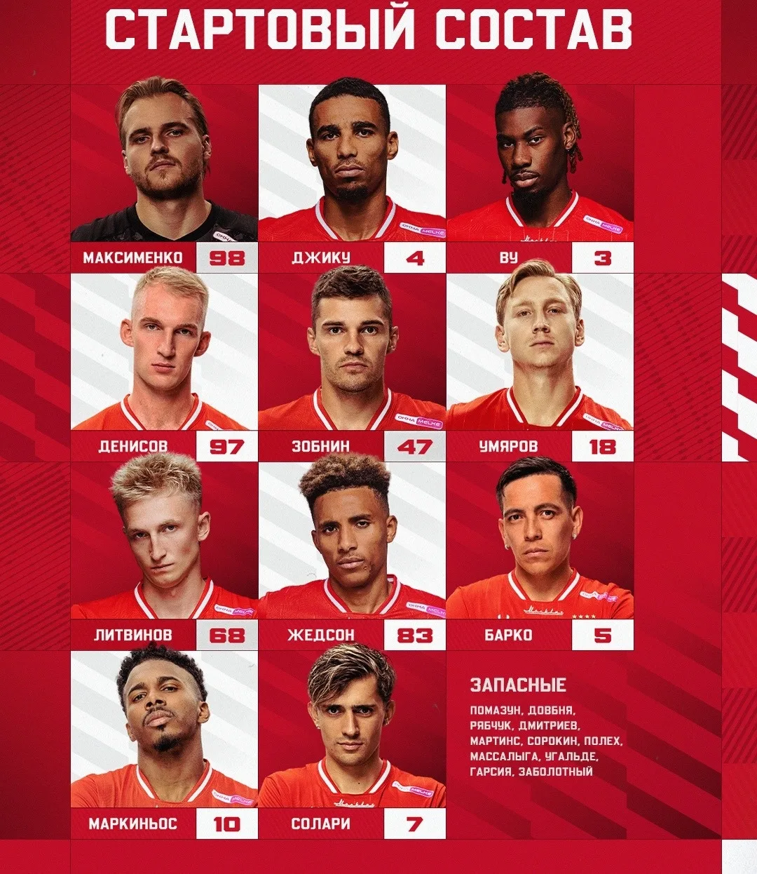 🔴 Стартовый состав «Спартака» на кубковый матч с «Зенитом»!