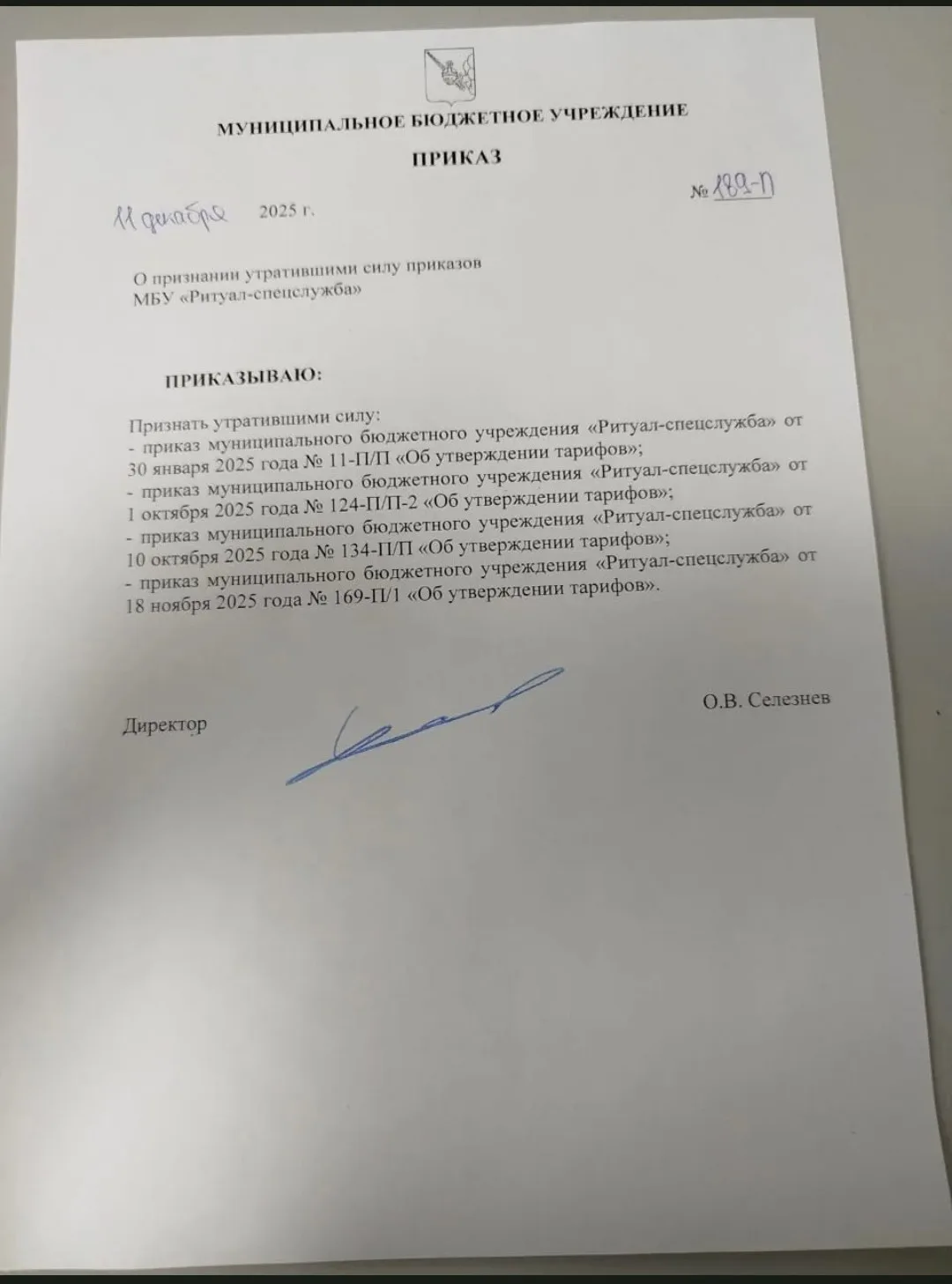 1. Главе города С.Г.Жестянникову — разобраться в ситуации и доложить, почему руководство муниципального учреждения «Ритуал-Спецслужба» применяло тарифы на ритуальные услуги, не согласованные в установленном порядке.