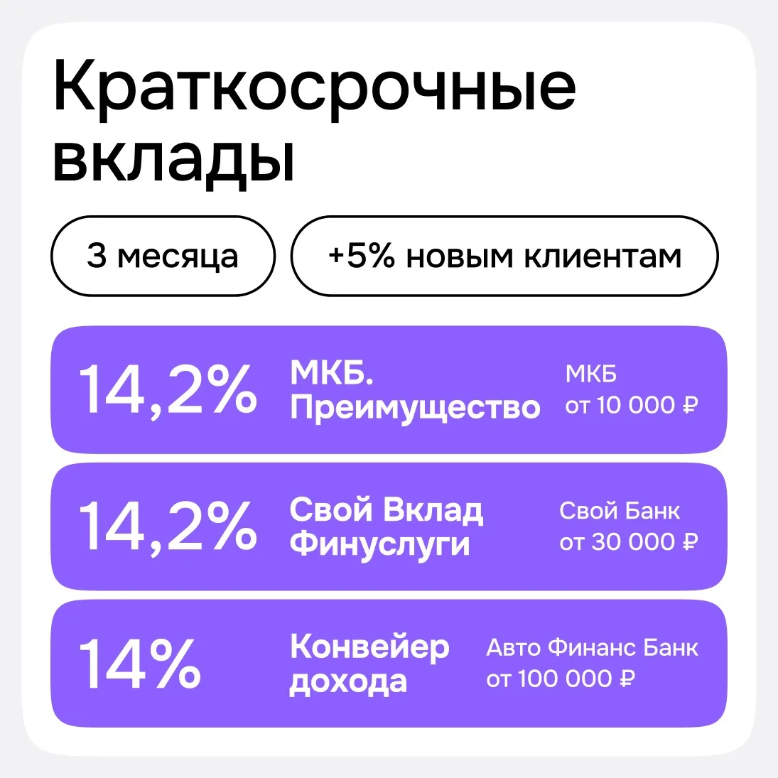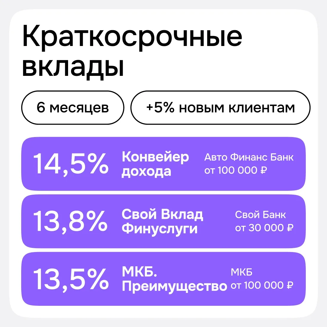 В Журнале рассказали, как использовать короткие и среднесрочные вклады, флоатеры и накопительные счета, чтобы не упустить выгоду. Подробнее о том, как сочетать эти инструменты под разные финансовые цели, читайте в нашей статье.