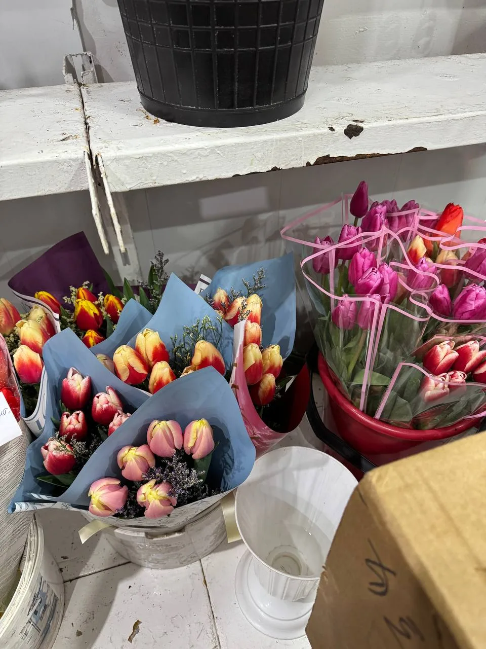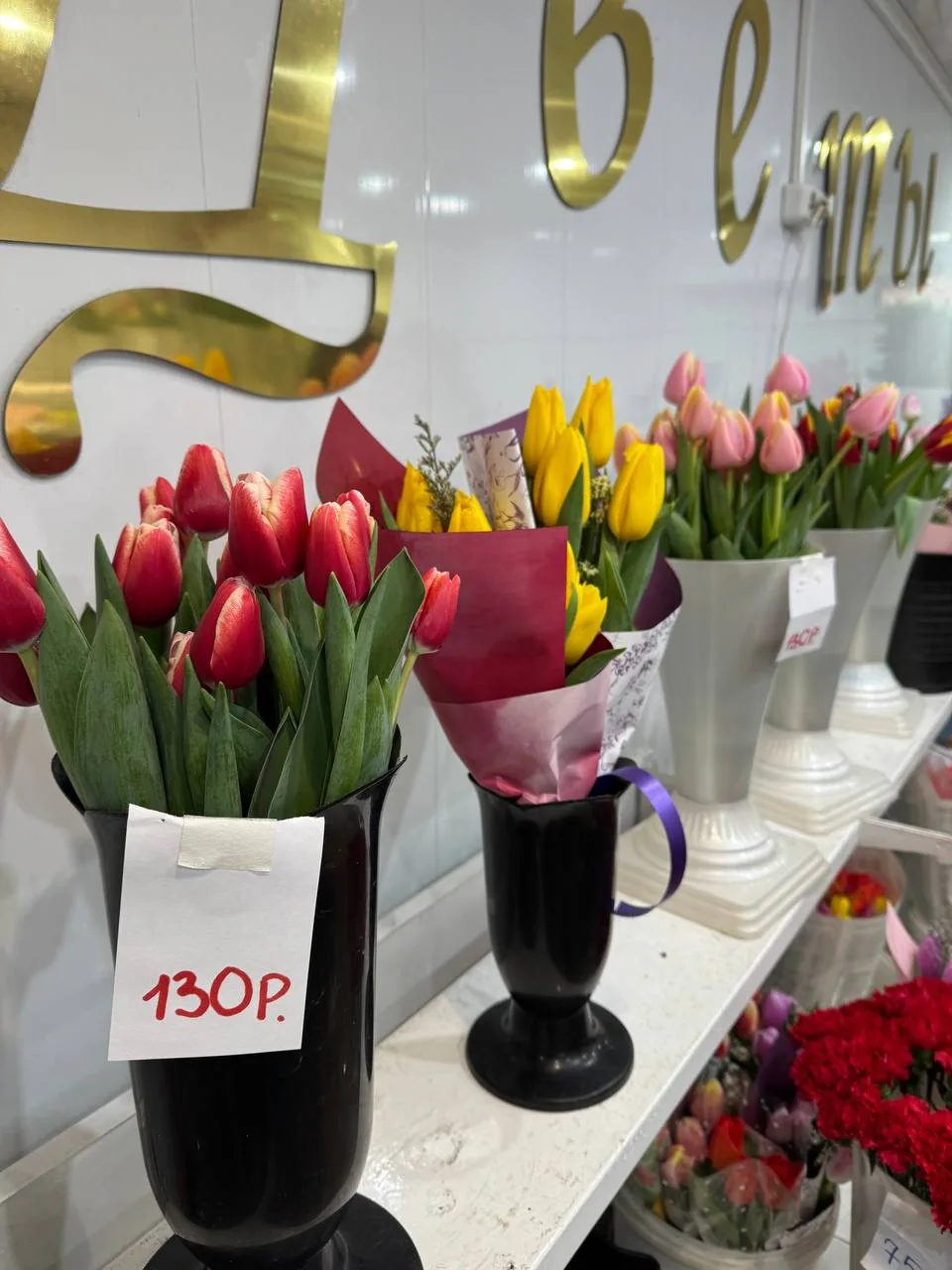Потихоньку готовимся к празднику. Цветы потихоньку дорожают, тюльпаны 130-200, хризантемы 300-400, розы от 250 -400.
