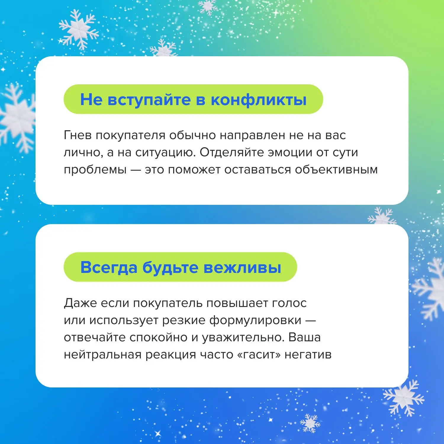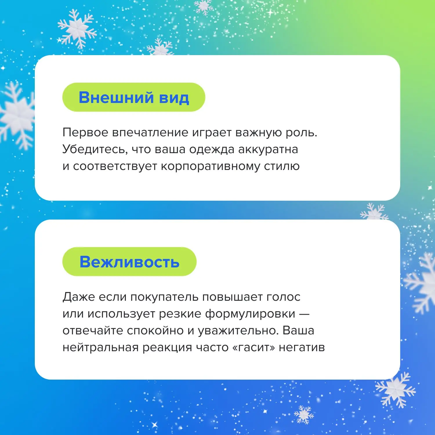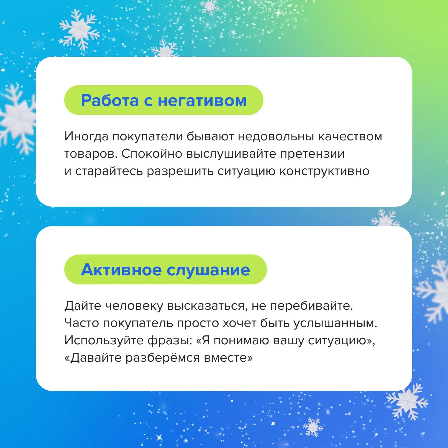 🛒Например, предложить помочь найти то, что они ищут, ответить на их вопросы или рассказать интересные факты о товарах, при этом обязательно выдерживать доброжелательный тон!