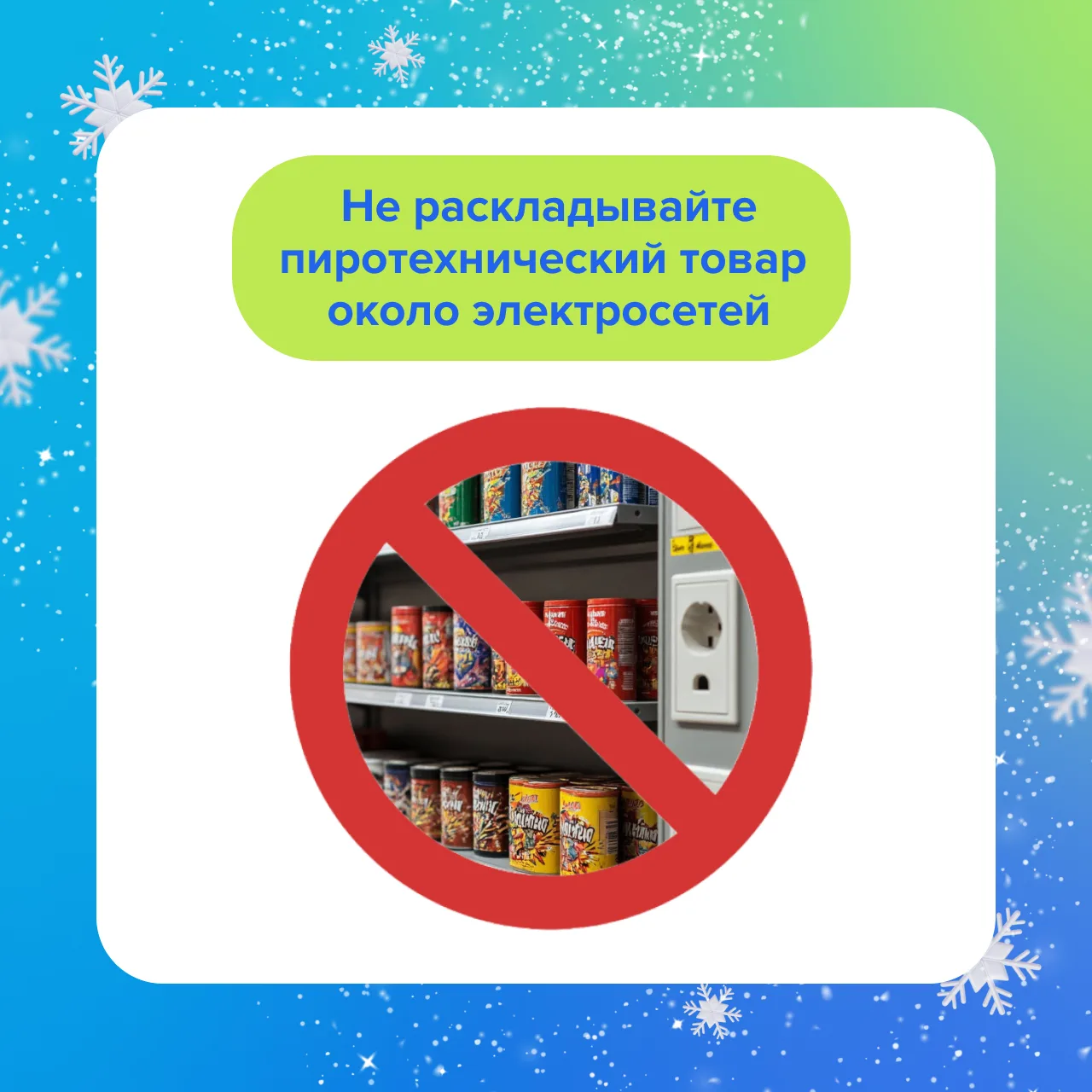 ➡️ Уделяйте особое внимание расположению пиротехники в торговом зале и на складе. Ни в коем случае не раскладывайте товар около электросетей, розеток, блоков питания и т.д.