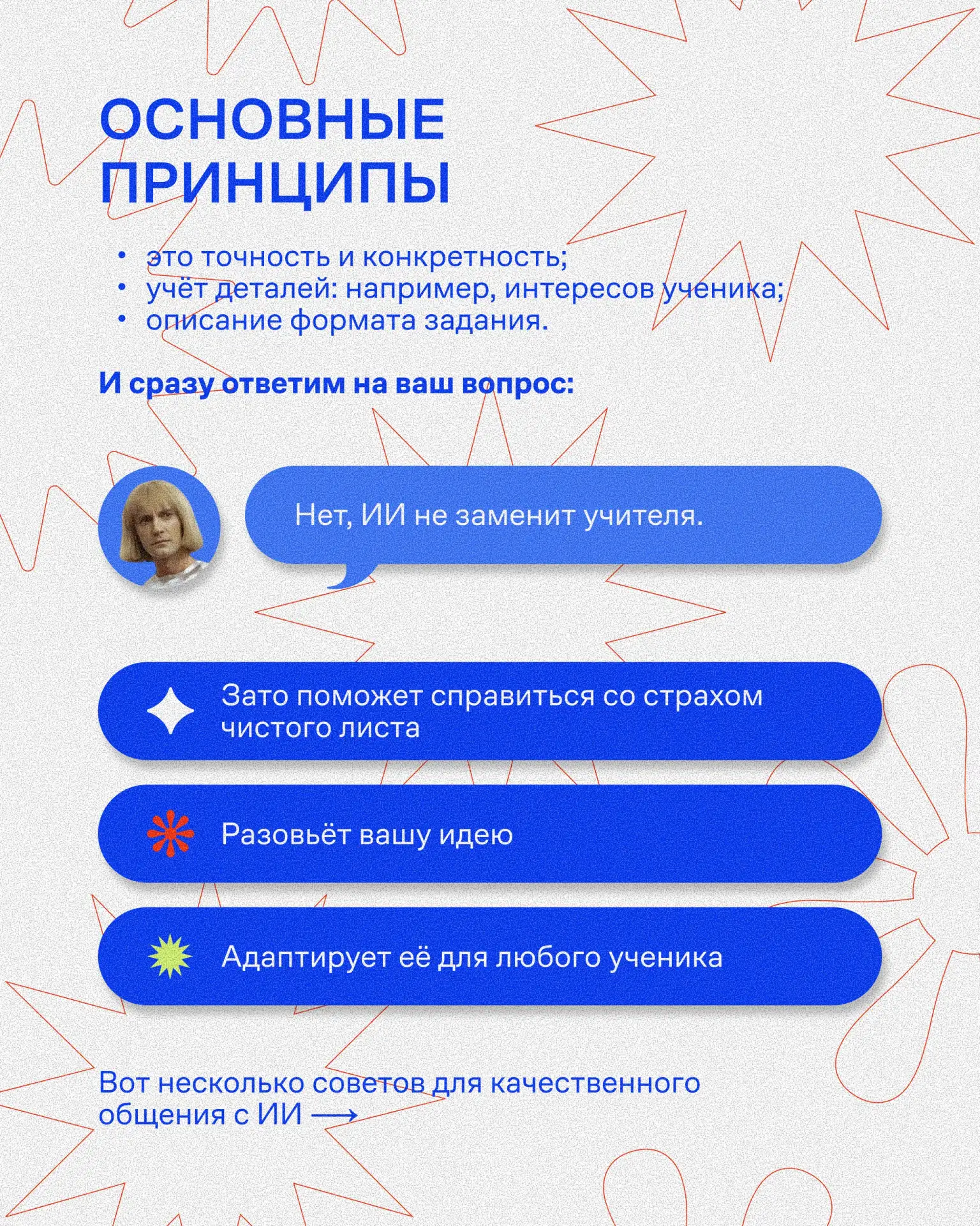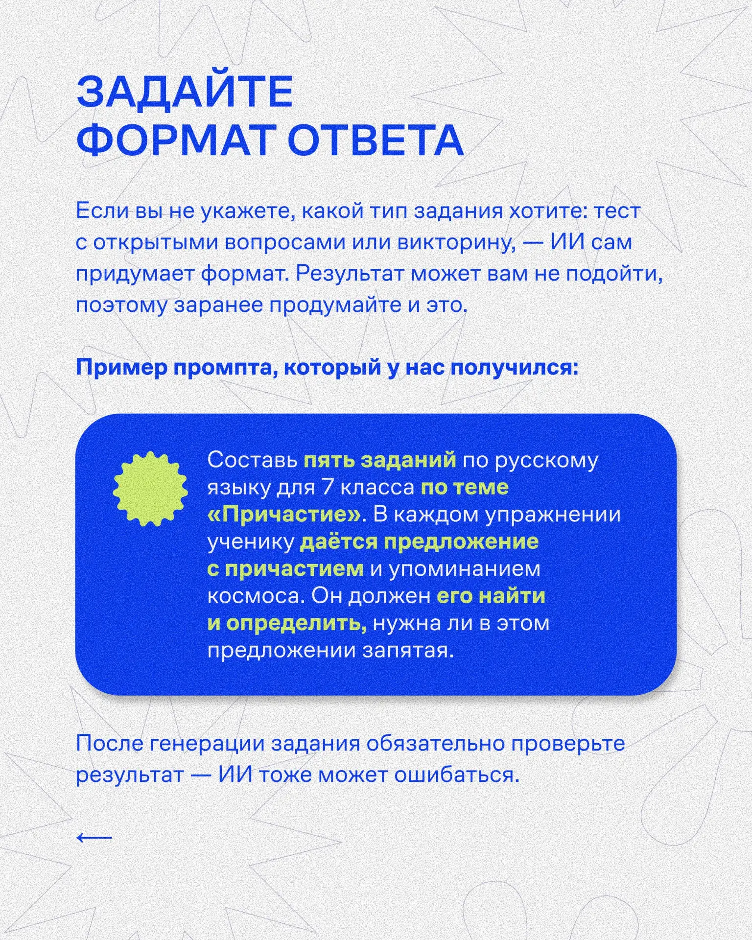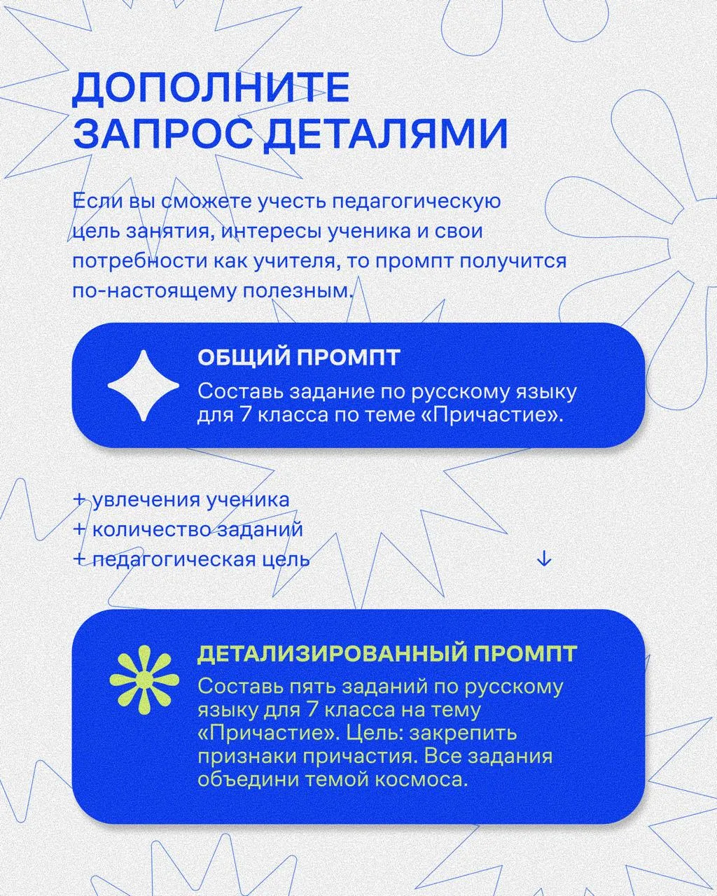 В карточках рассказываем, как формулировать запросы так, чтобы ИИ действительно помогал в работе.