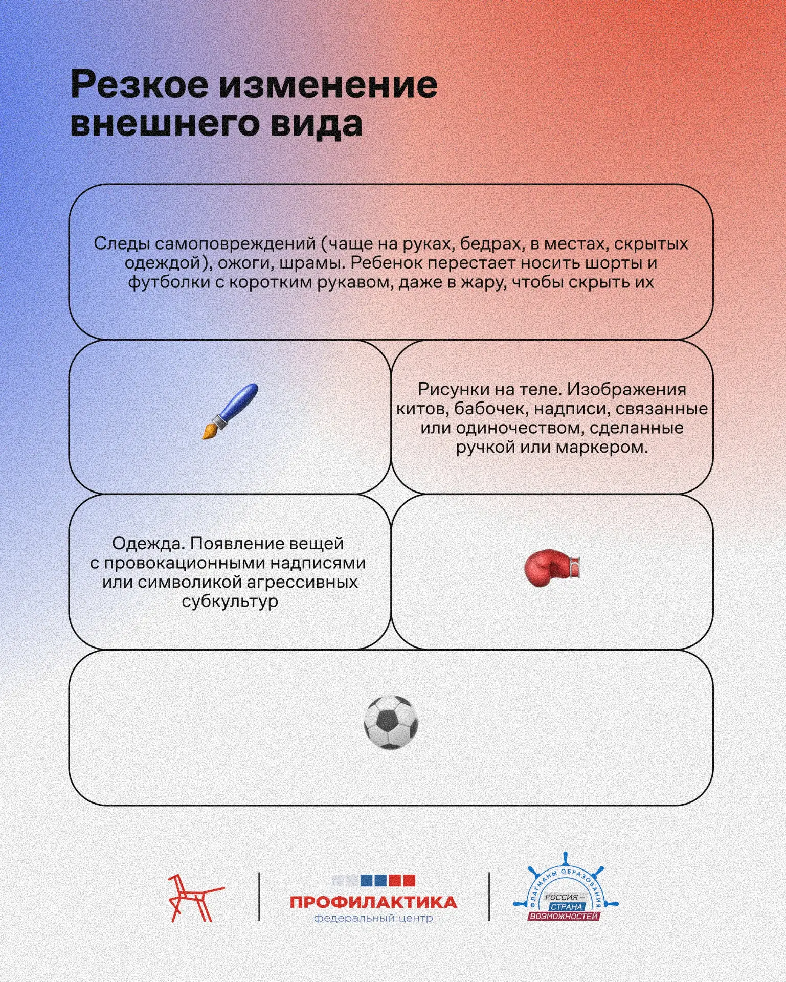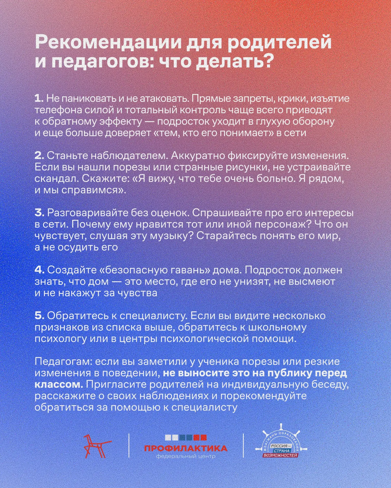 Федеральный центр «Профилактика» подготовил материал, благодаря которому вы сможете вовремя заметить тревожные сигналы. В карточках собраны рекомендации, которые помогут вам распознать маркеры опасного поведения и понять психологические особенности ребенка, попавшего под влияние деструктивного контента.