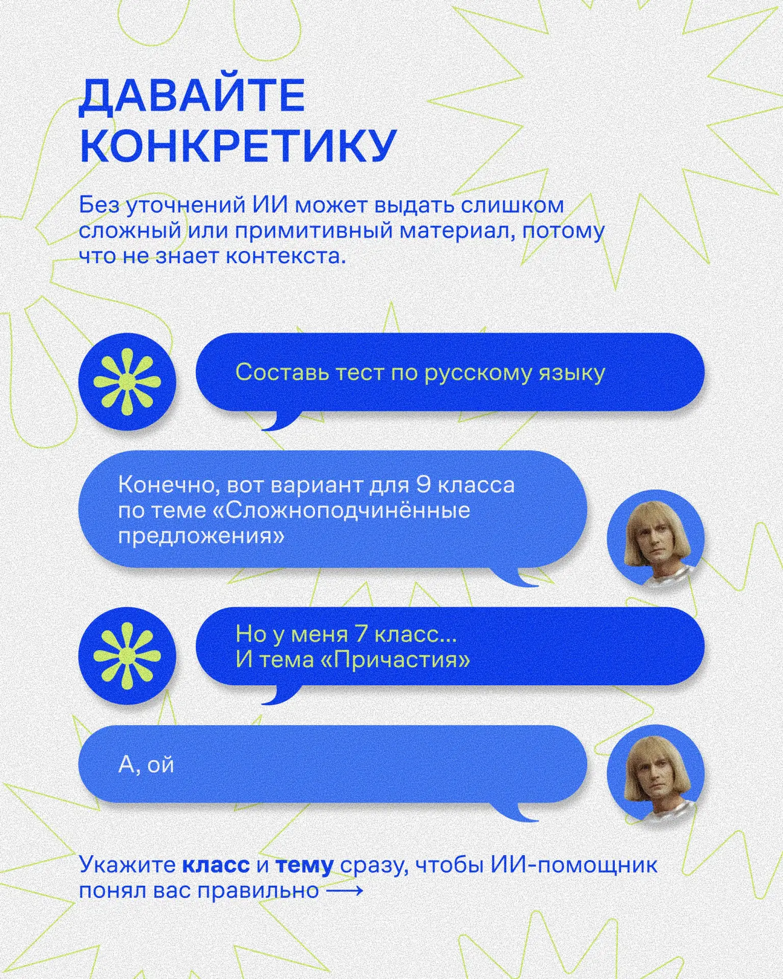 Например, если просто попросить составить тест по русскому языку для 7 класса, результат получится довольно общим. Но если уточнить тему, формат задания и добавить контекст – задание будет гораздо точнее и интереснее.