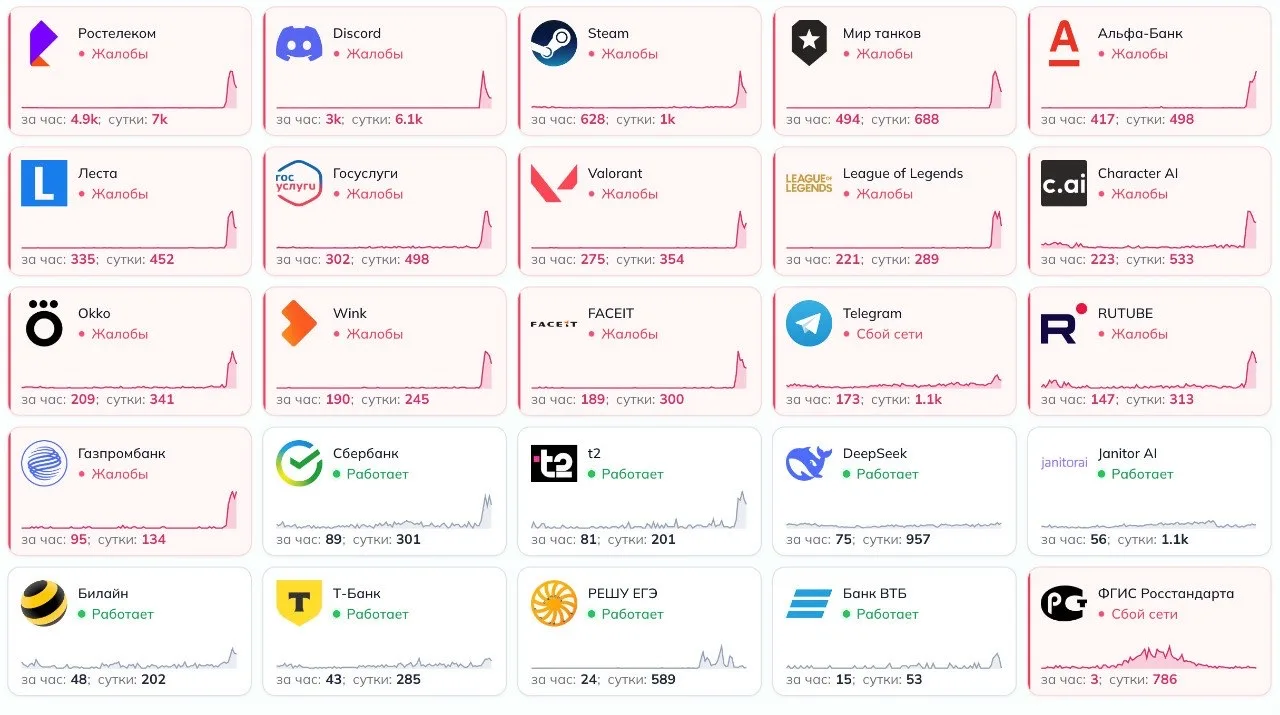 Плохо работают онлайн-кинотеатры, игровые платформы, банковские приложения и соцсети.