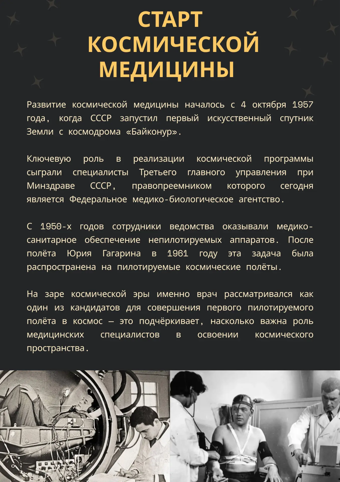 🩺 За десятилетиями космических достижений — важнейшая работа, без которой покорение космоса было бы невозможным. Об истории становления космической медицины, медицинском обеспечении космонавтов, современных научных разработках и перспективных проектах — в наших карточках.