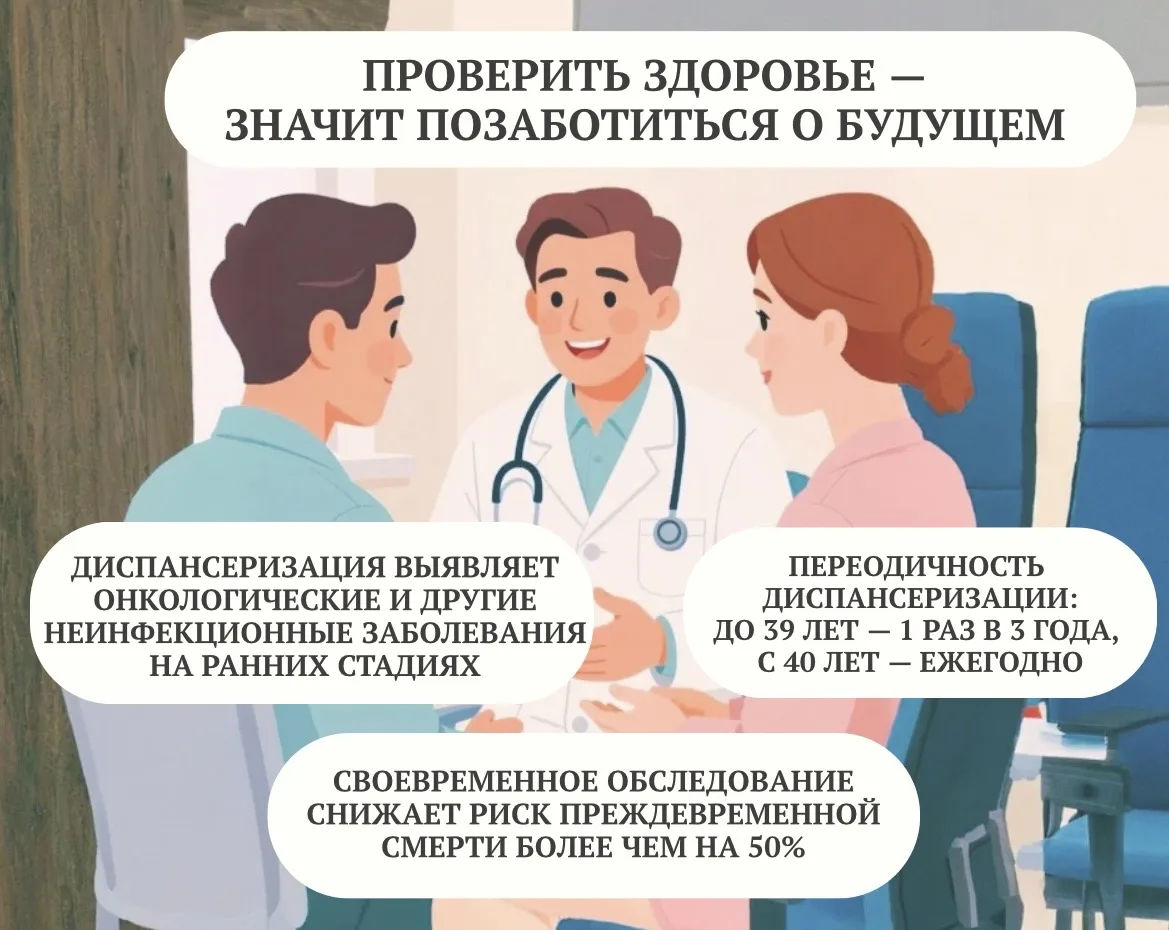 🩺 Диспансеризация — комплекс обследований, включающий профилактический медицинский осмотр и дополнительные методы проверки здоровья. Плановое обследование дает возможность на ранних стадиях выявить неинфекционные заболевания, в том числе онкологические, и оценить риски их развития.