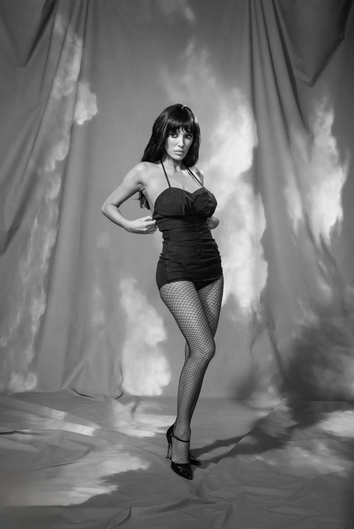 Под ним, как и в оригинальном образе 34 года назад, Робби была одета в черную микро-мини-юбку и красные чулки с розовой шелковой лентой.