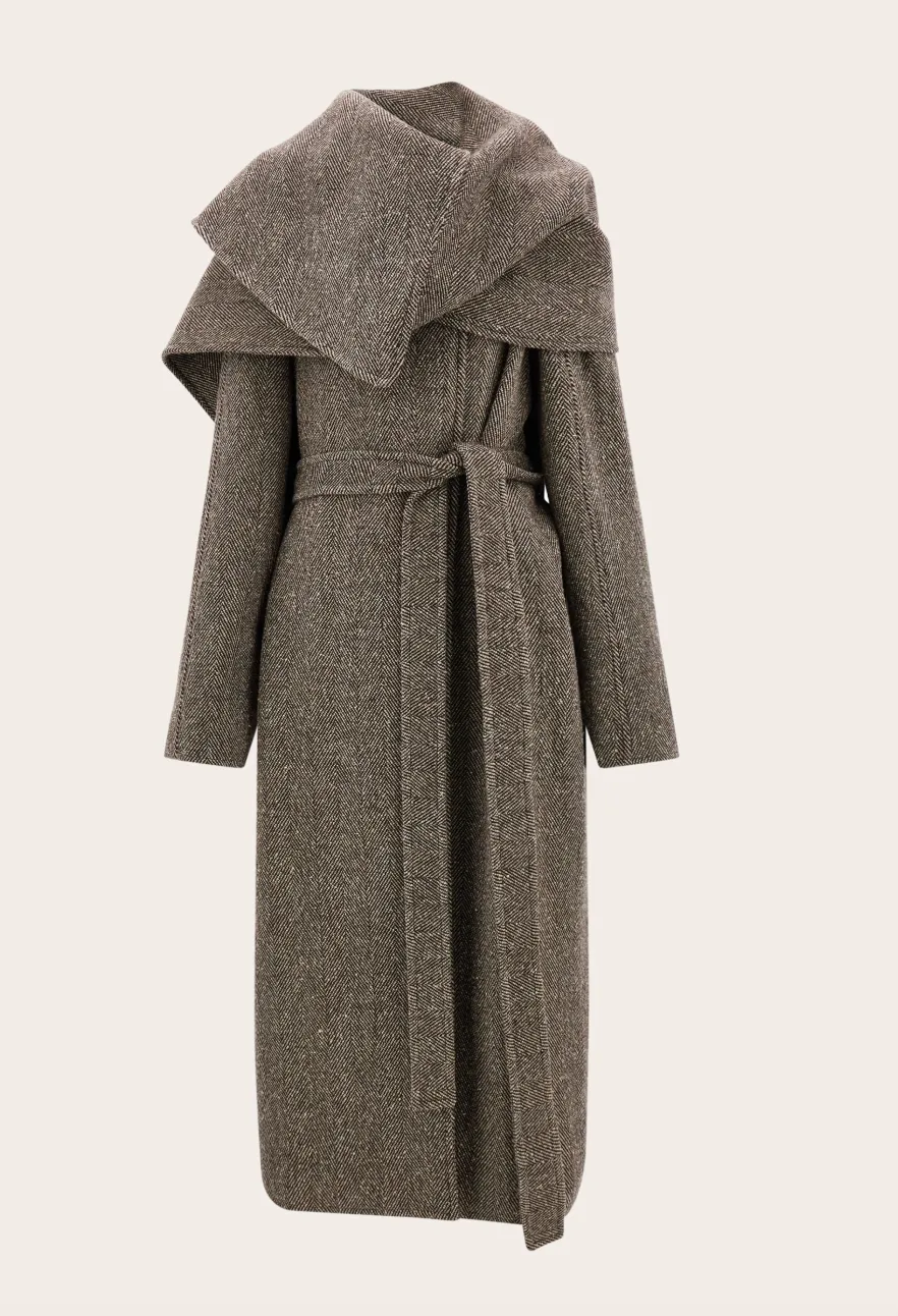Нестареющая, но с современными деталями, модель Ferragamo глубокого серого цвета была сшита из смеси шерсти и хлопка, что придавало ей уютный и мягкий вид.