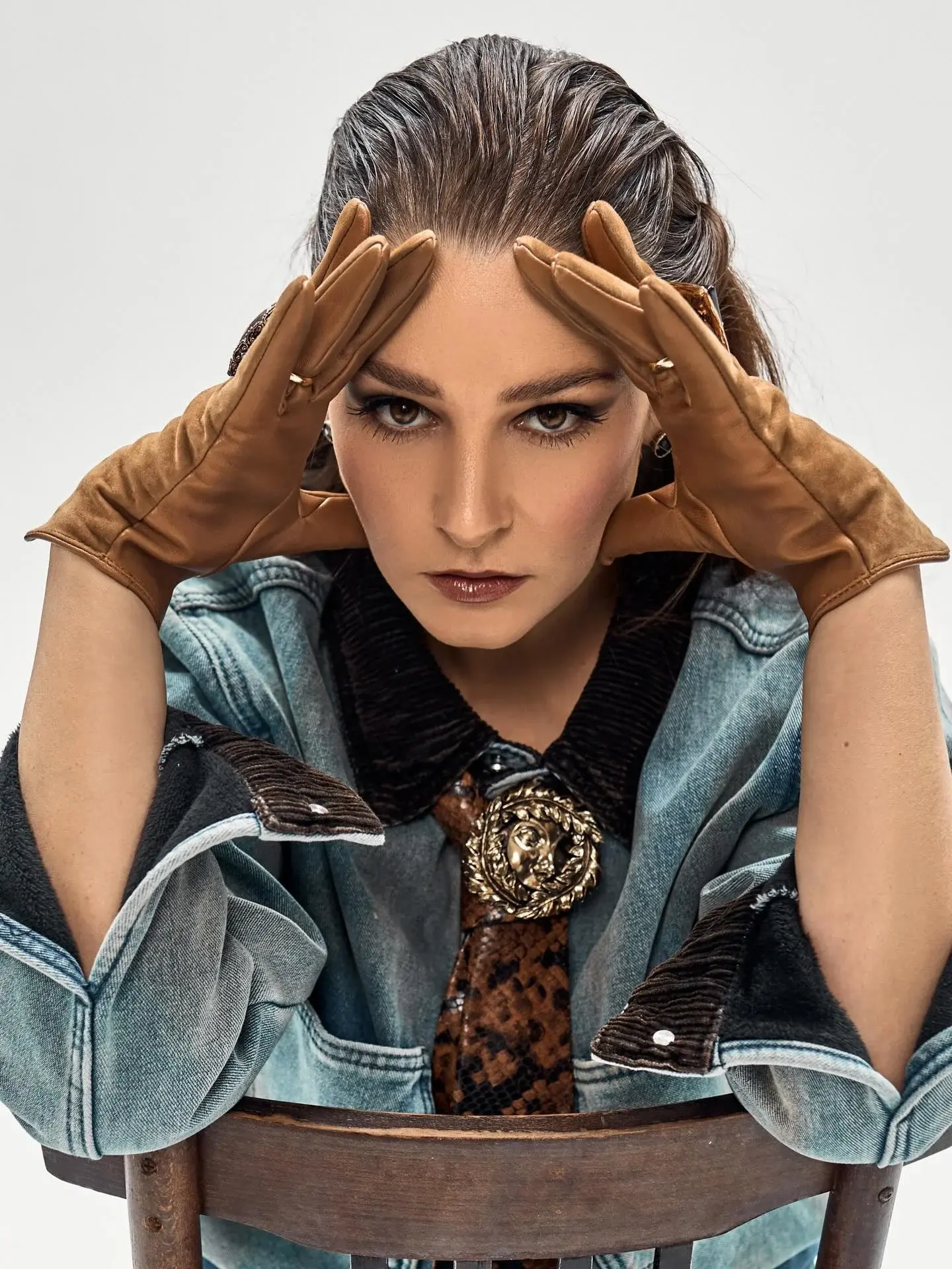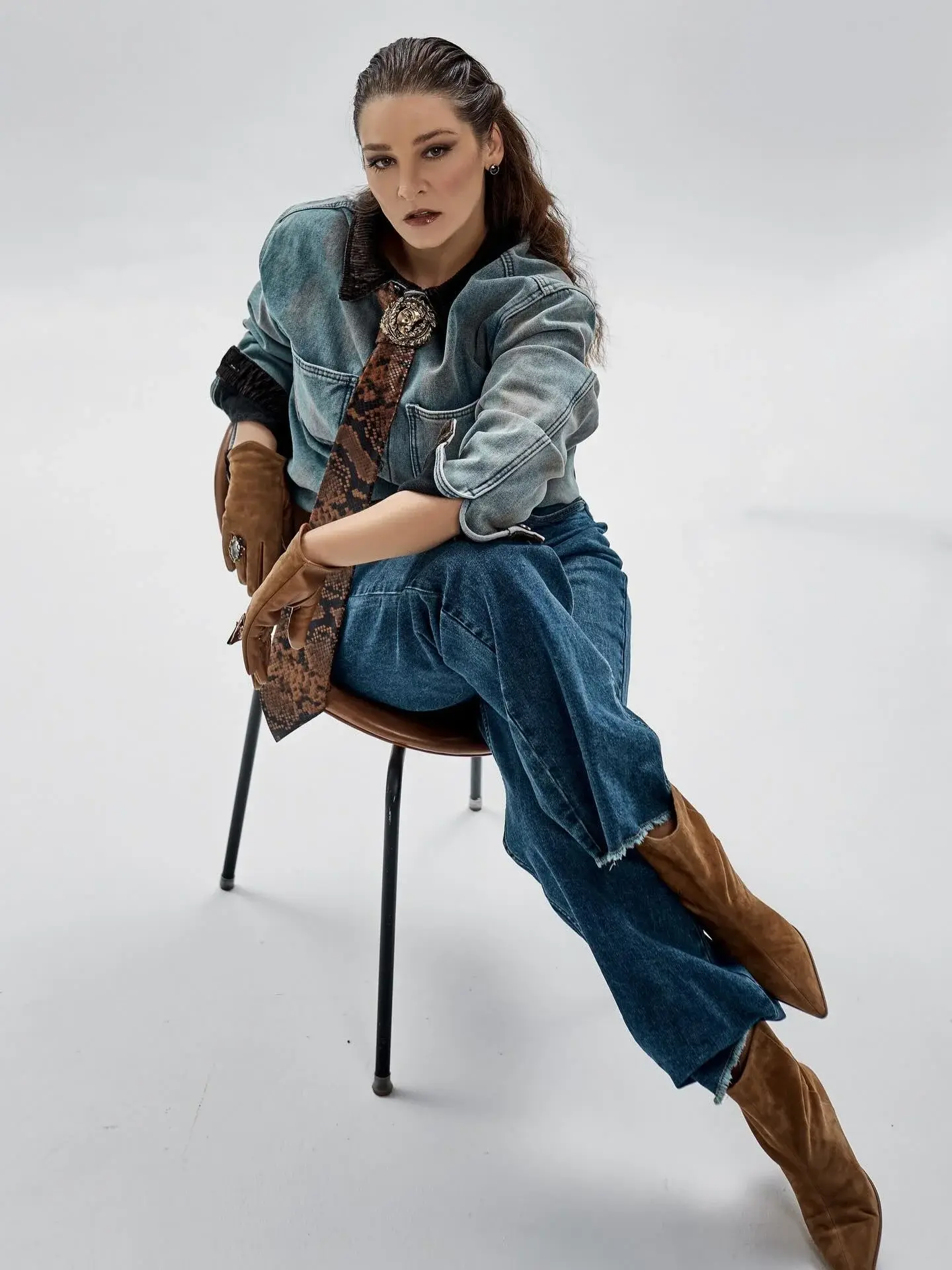На кадрах она непринуждённо сидит на стуле, а её джинсовый наряд оживляют яркие детали: длинный галстук с экзотическим змеиным принтом, украшенный крупной брошью, полусапожки в тон и выразительные рыжие кожаные перчатки.
